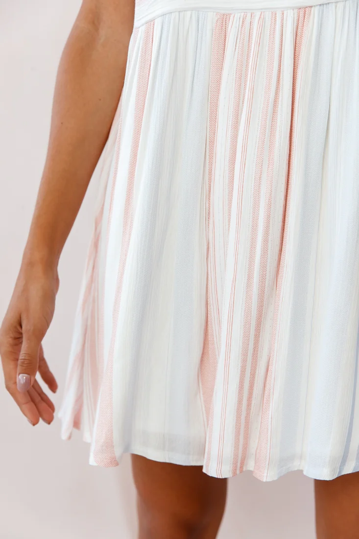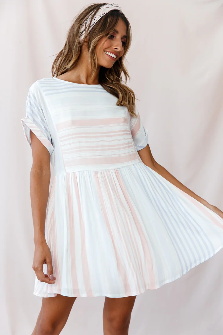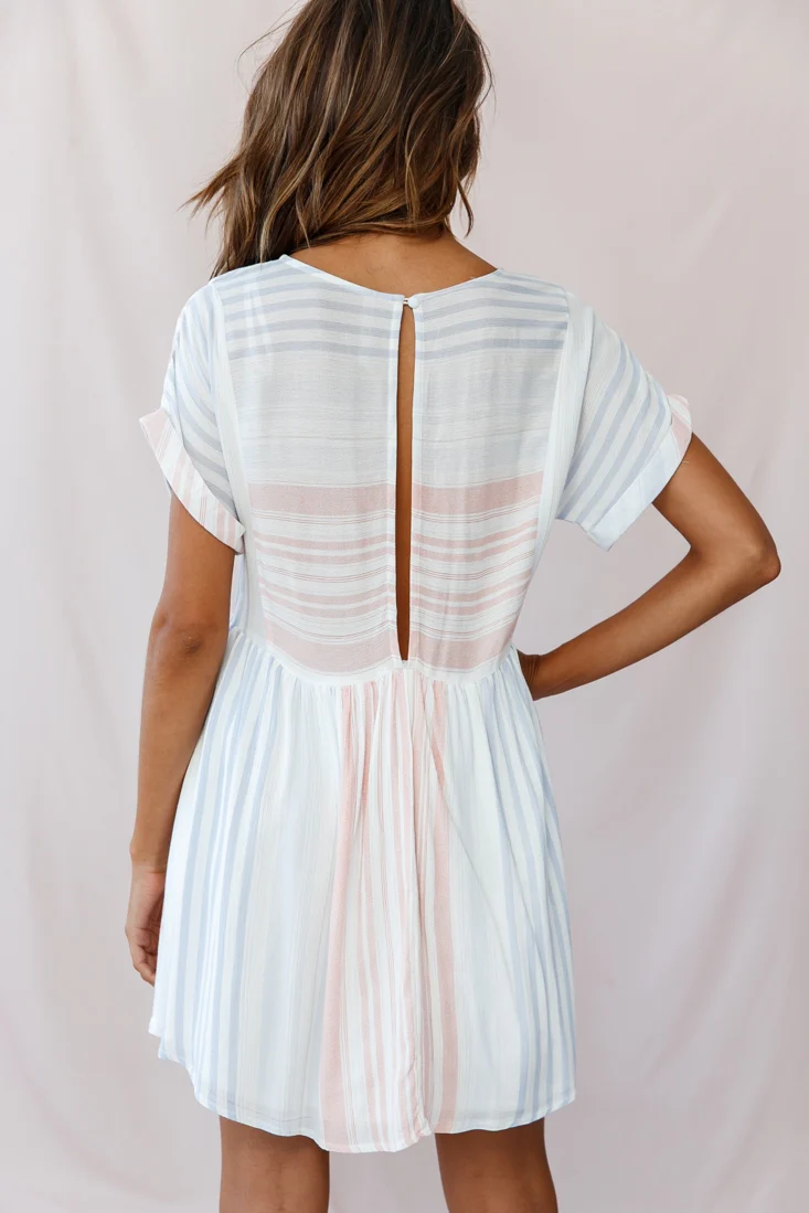 Susie Rolled Sleeve Crew Neck Swing Dress Stripe Print Blue/Peach