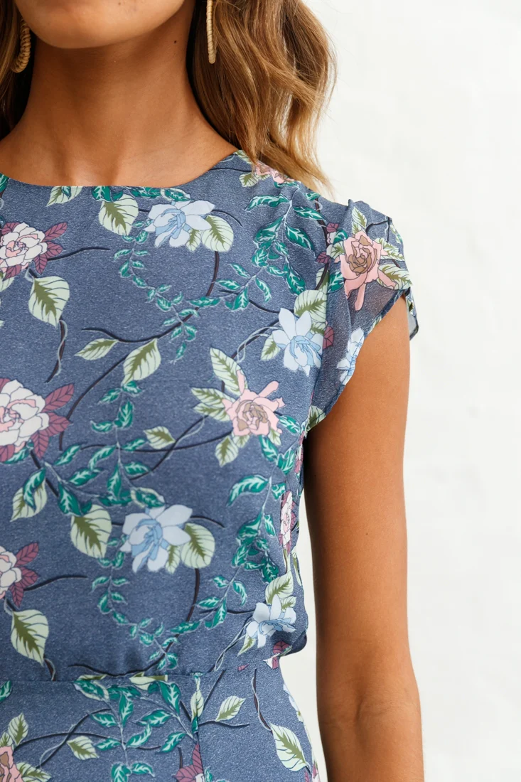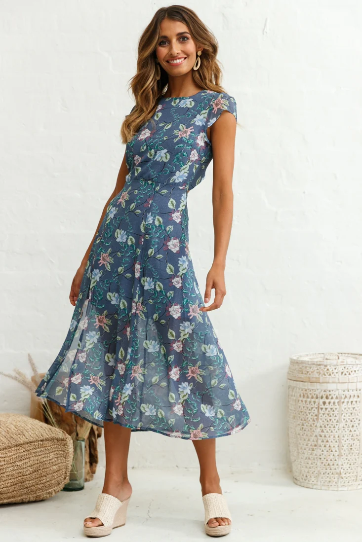 Becky Cap Sleeve Crew Neck Midi Dress Floral Print Ink