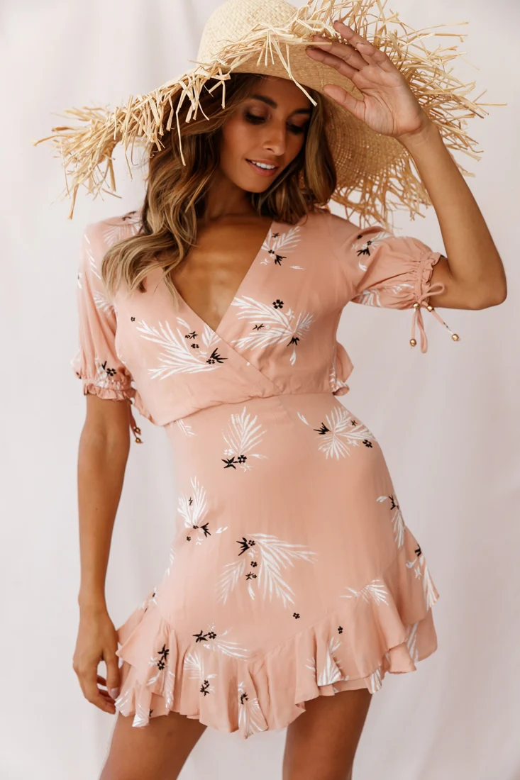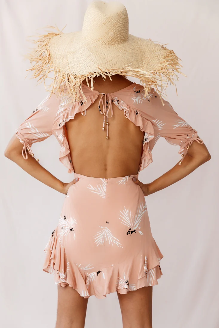 Lilo Surplice Neckline Cut-Out Back Dress Botanic Print Nude
