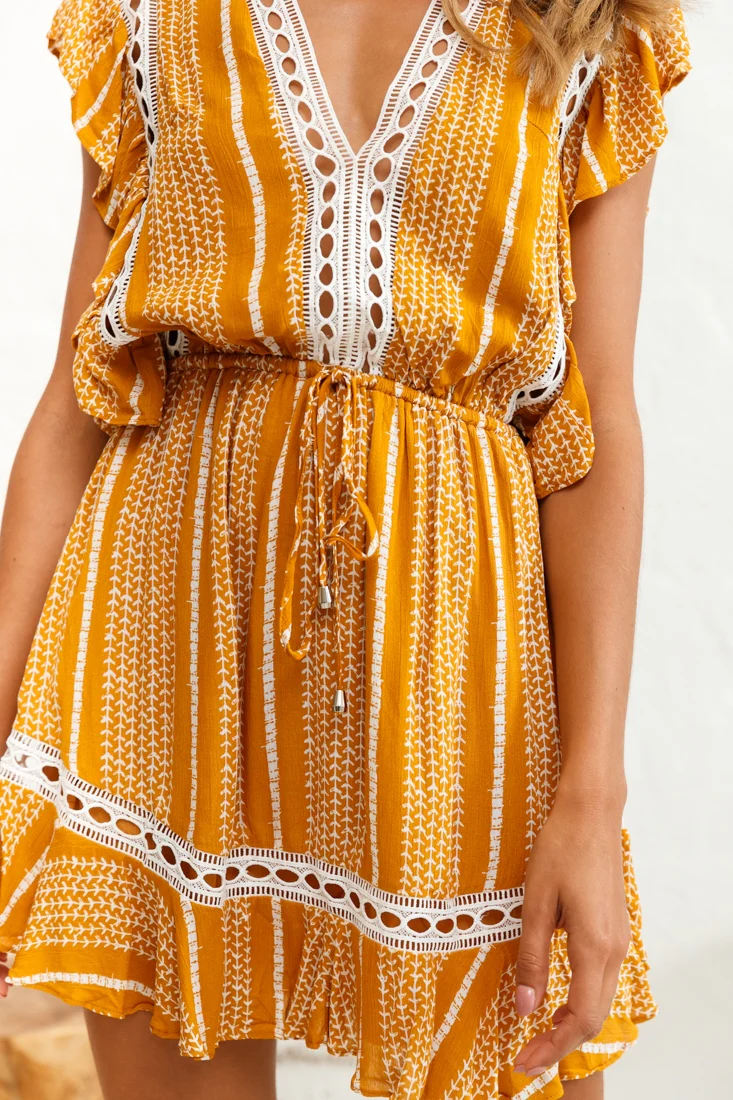 Maranatha Crochet Trim Drawstring Waist Dress Vine Print Mustard