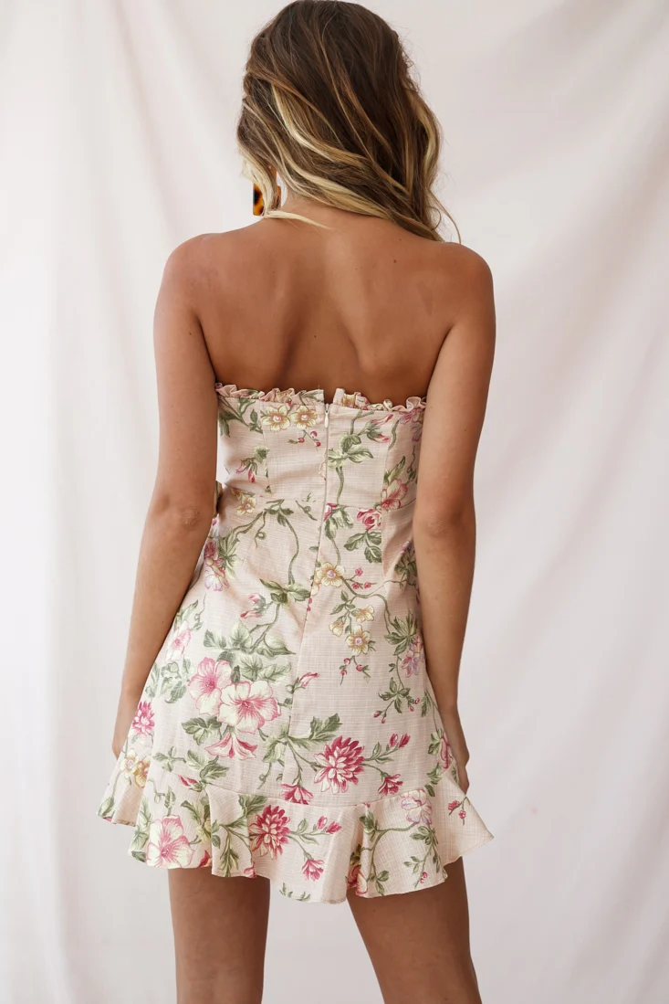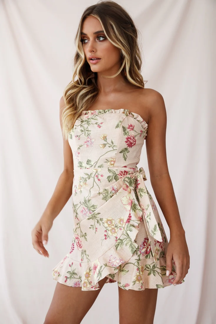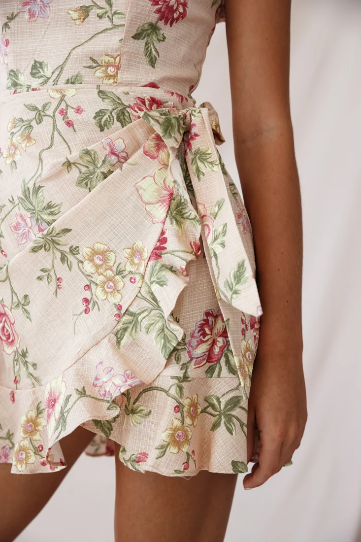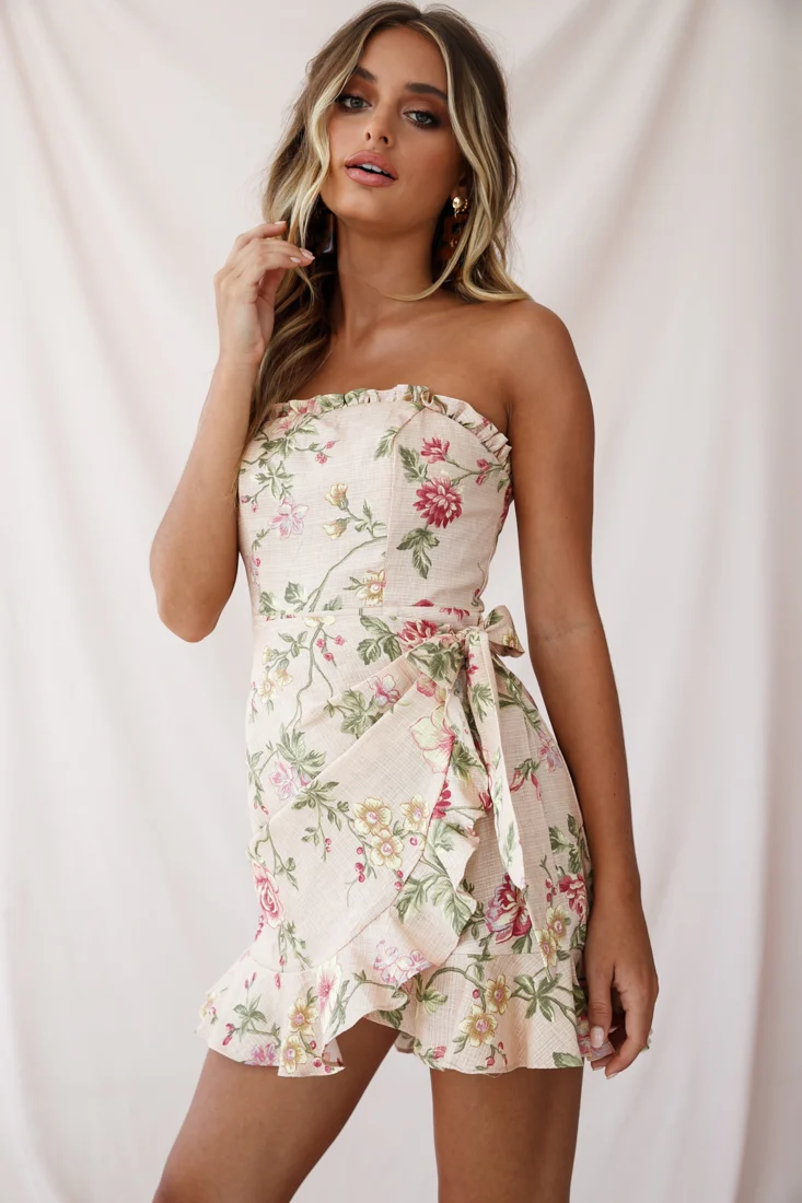 Stacey Frill Bustier Wrap Dress Floral Print Nude