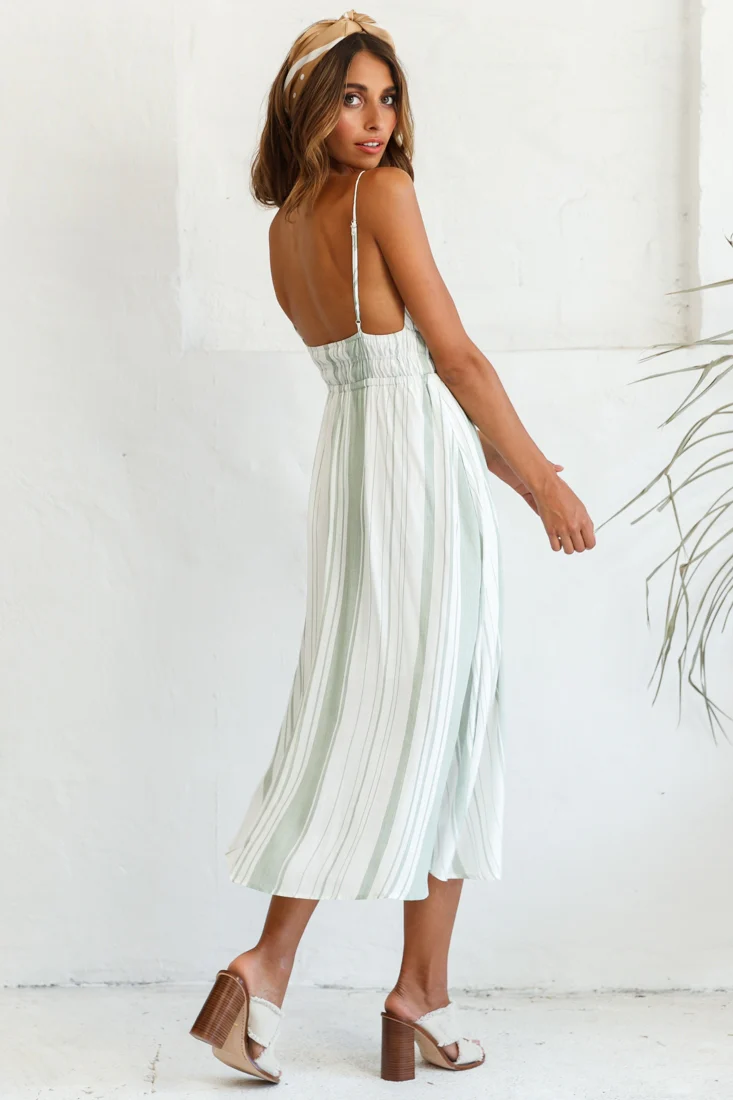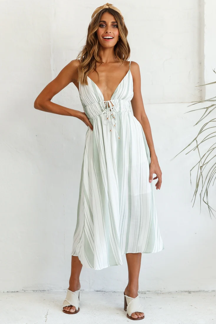 Hosanna Drawstring Detail Pocket Midi Dress Stripe Print Olive