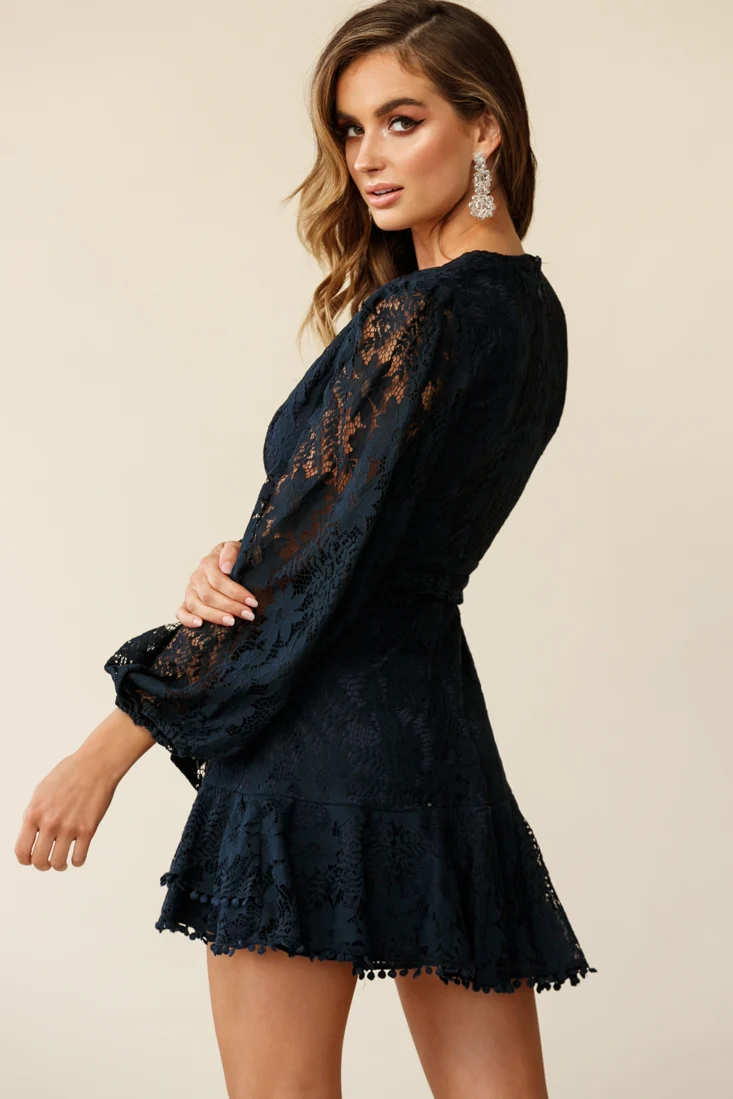 Cami Balloon Sleeve Faux Wrap Dress Lace Navy