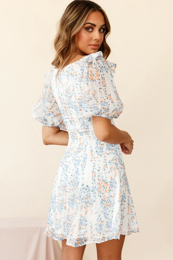 Cherub Puff Sleeve Sweetheart Neckline Dress Floral Print White