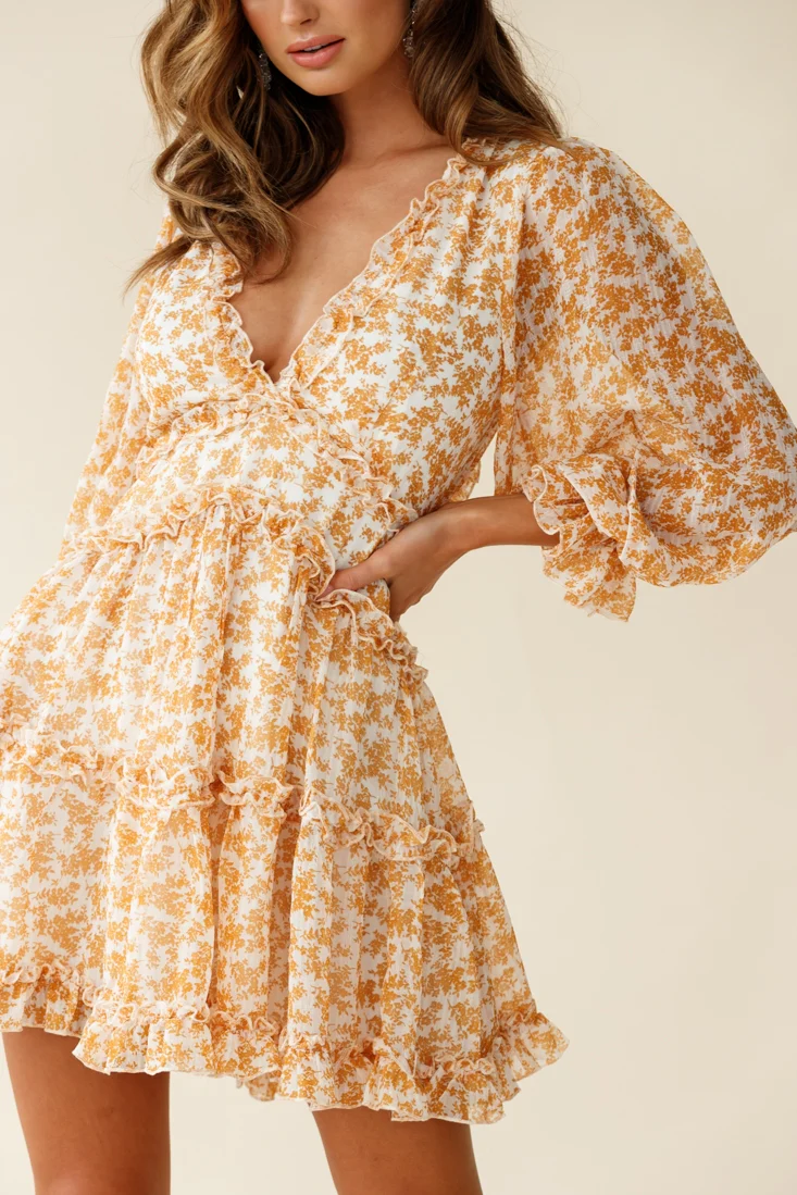 Laney Cutout Back Balloon Sleeve Dress Floral Print Mustard