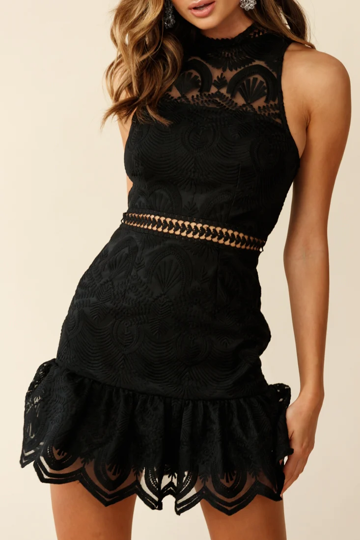 Hiromi Sleeveless Embroidered Mesh Overlay Dress Black