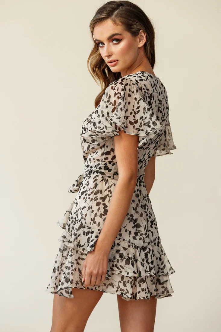 Kerry Layered Angel Sleeve Dress Leaf Print Beige