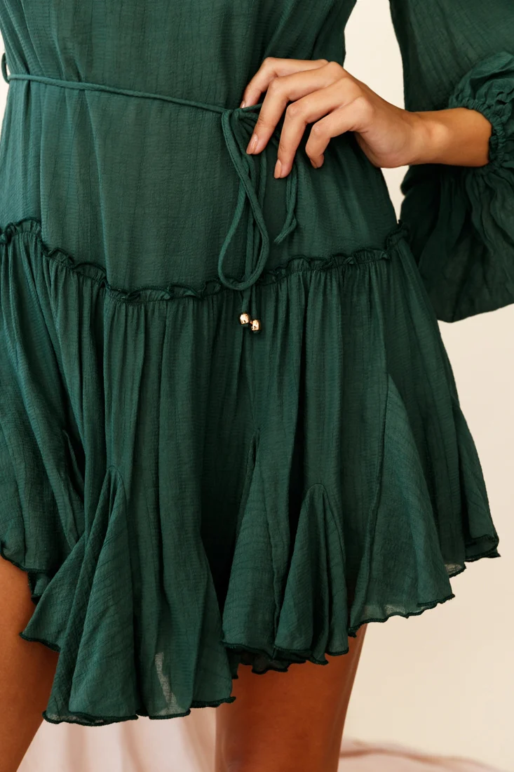 Duly Noted Frill Shoulder Asymmetrical Hem Dress Forest Green