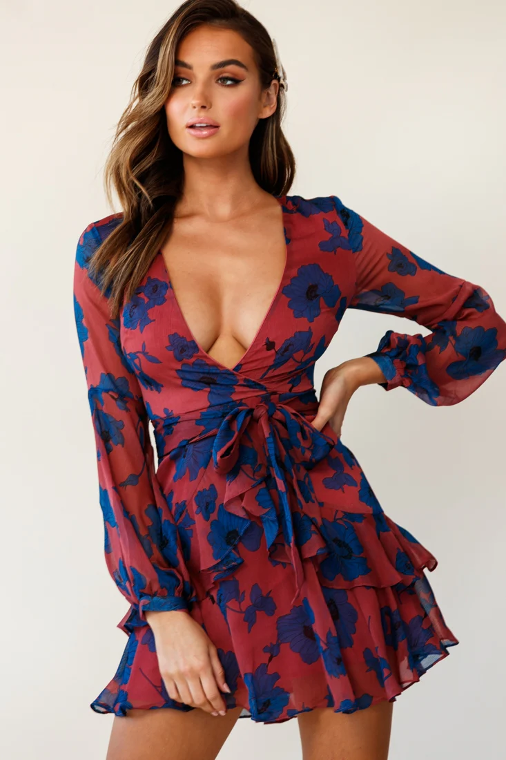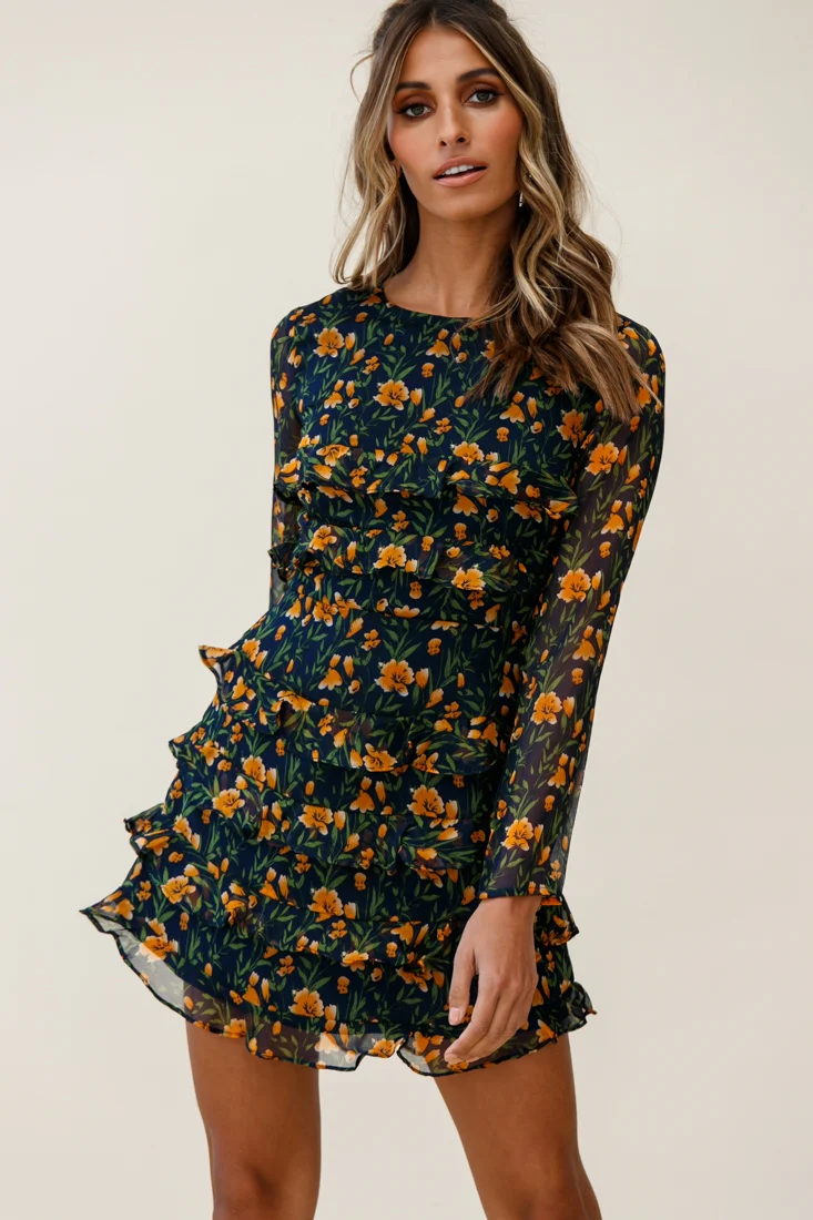 Charmaine Long Sleeve Tiered Frill Dress Floral Print Navy