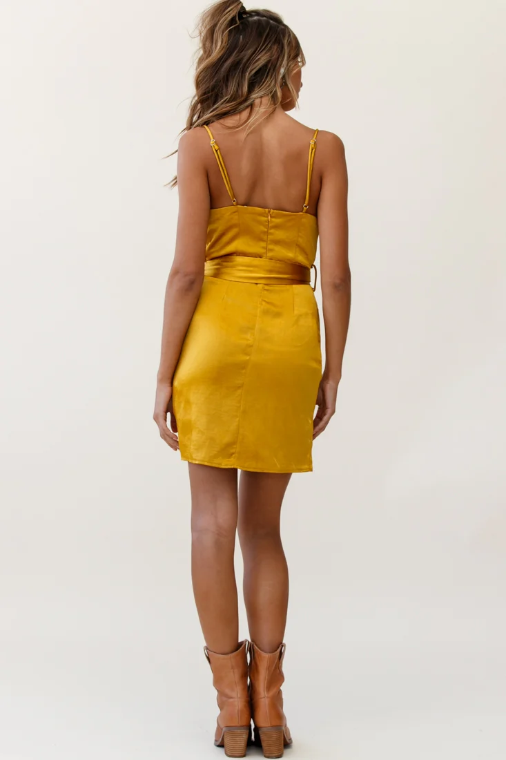 Bebe Satin Cowl Neck Wrap Dress Mustard