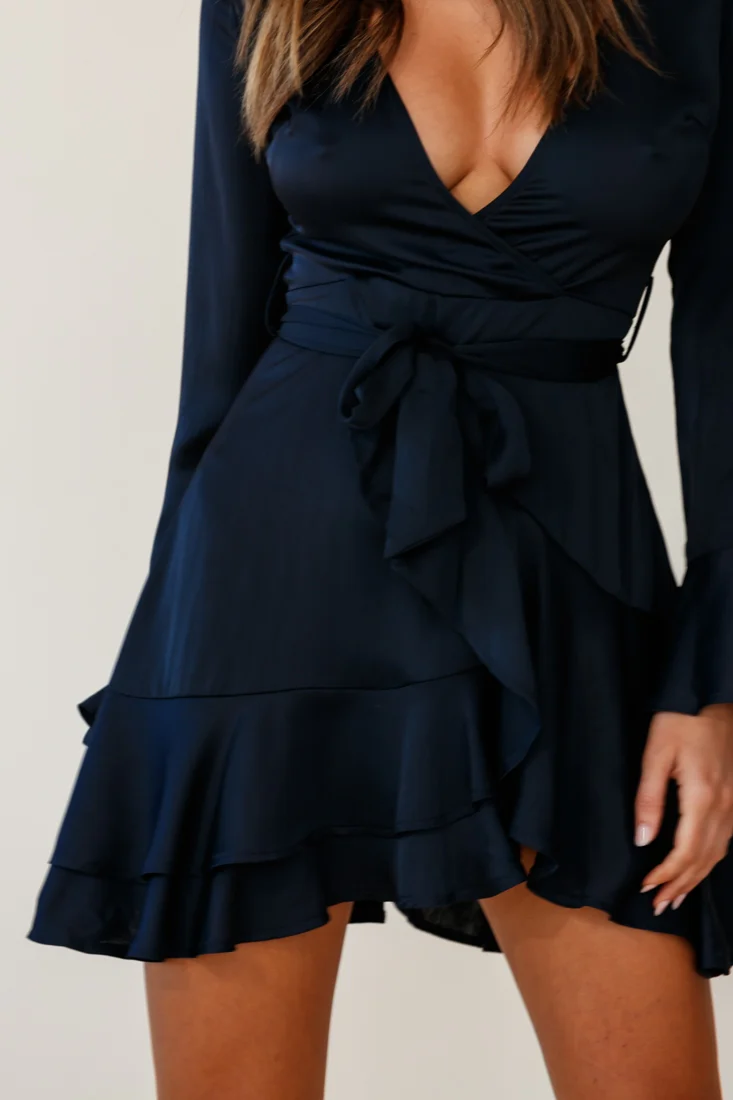 Khandi Long Sleeve Ruffle Wrap Dress Navy