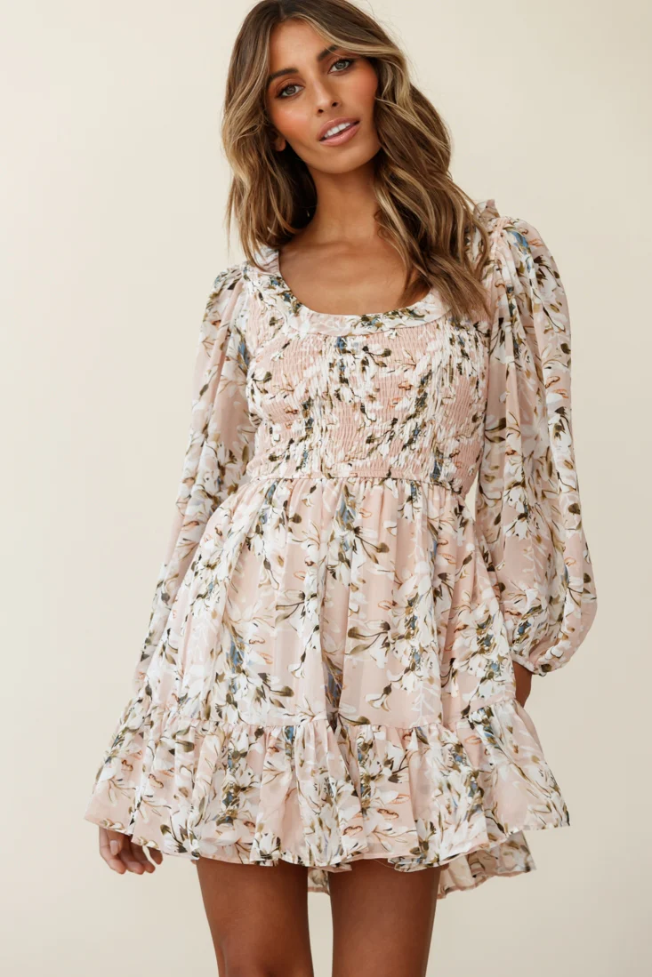 Athaliah Shirred Bust Balloon Sleeve Dress Floral Print Nude