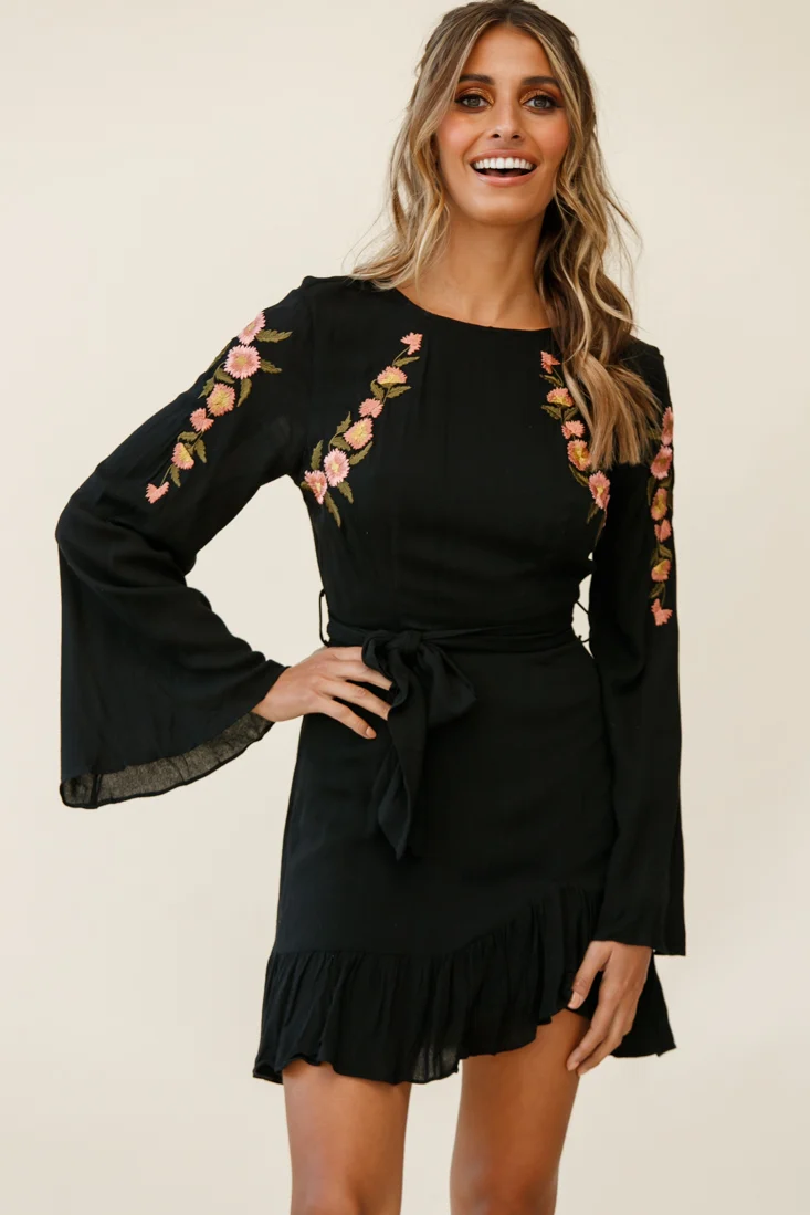 Kerry Layered Balloon Sleeve Dress Floral Print Black/Red