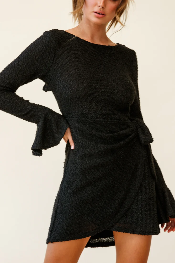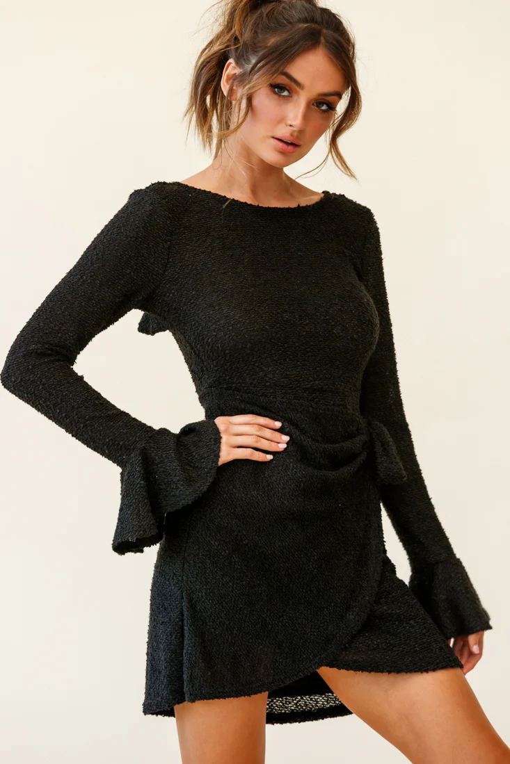 Dresden Long Sleeve Ruffle Detail Knit Dress Black
