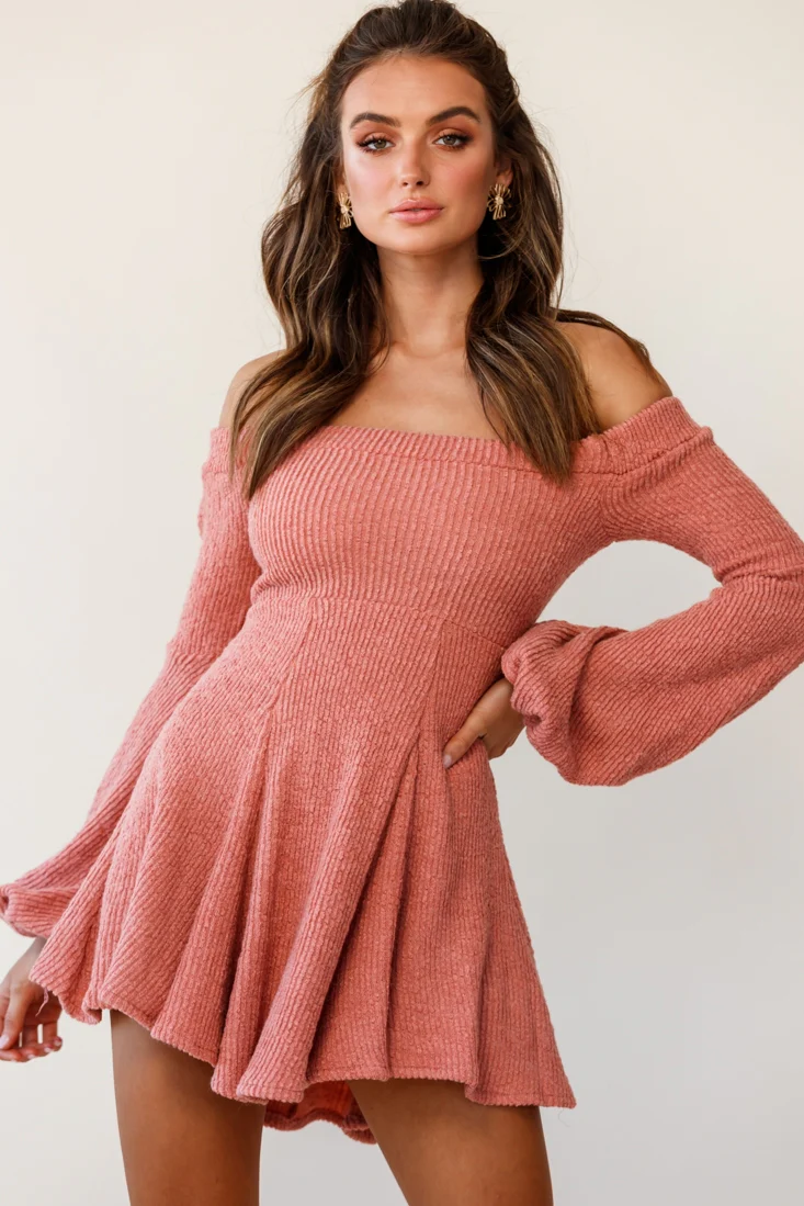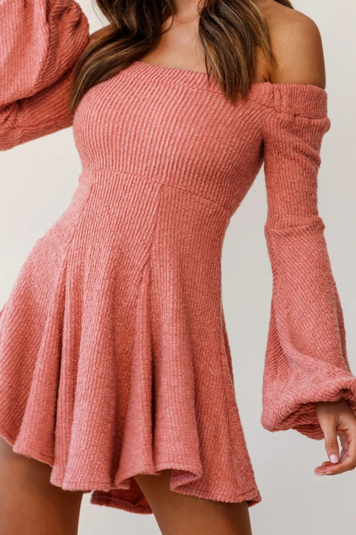 Runaway Off Shoulder Balloon Sleeve Knit Dress Rose