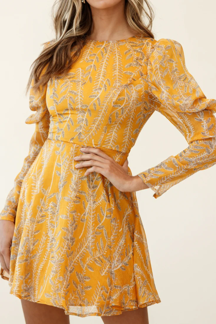 Ola Mutton Sleeve Lace-Up Back Dress Vine Print Mustard