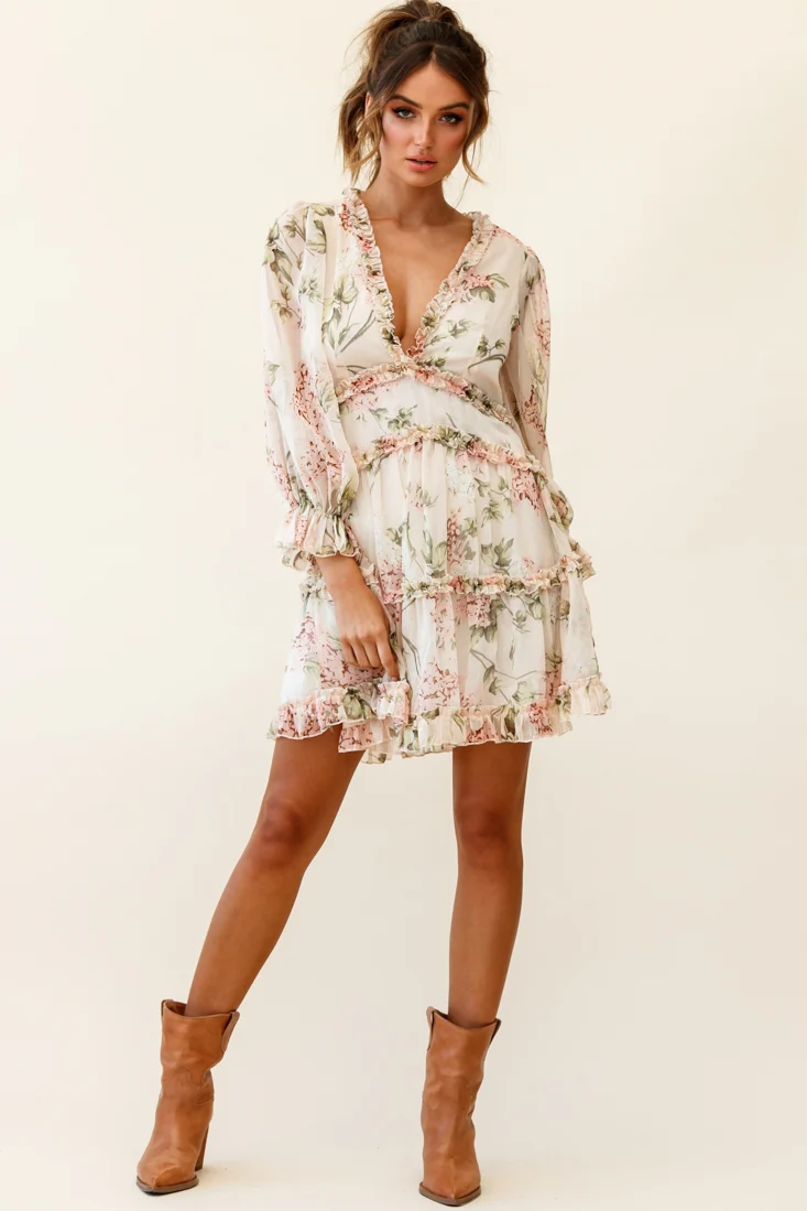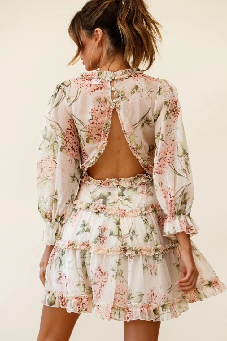 Laney Cutout Back Ruffle Trim Dress Hydrangea Print Nude