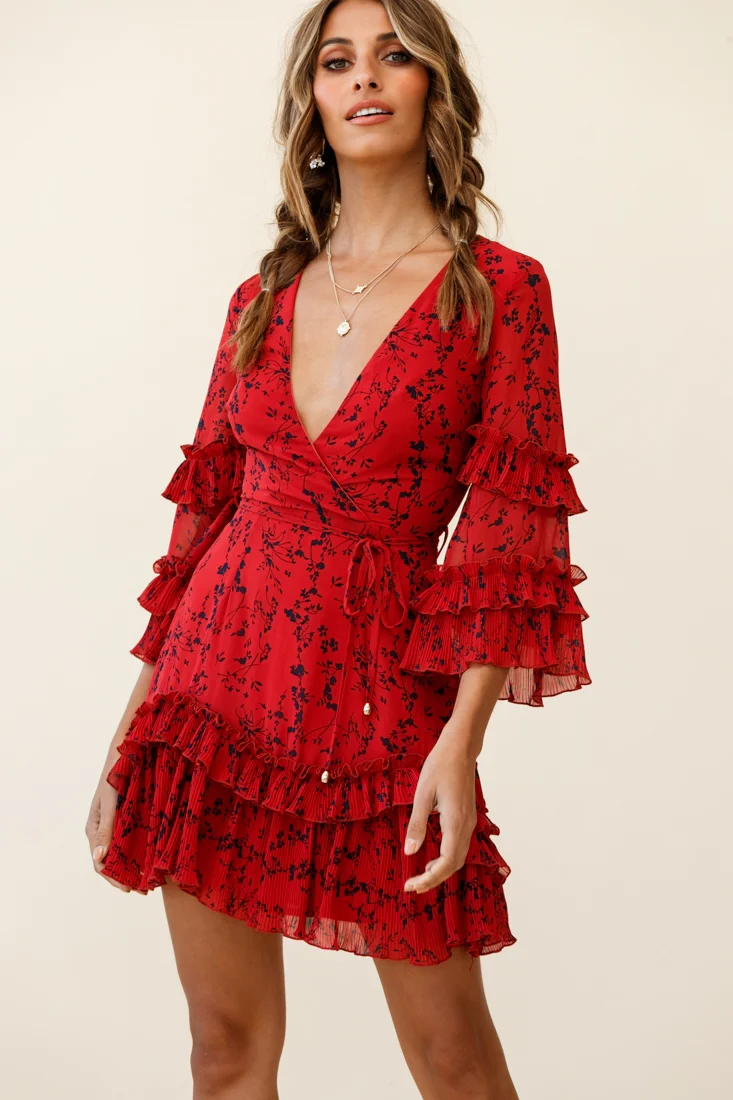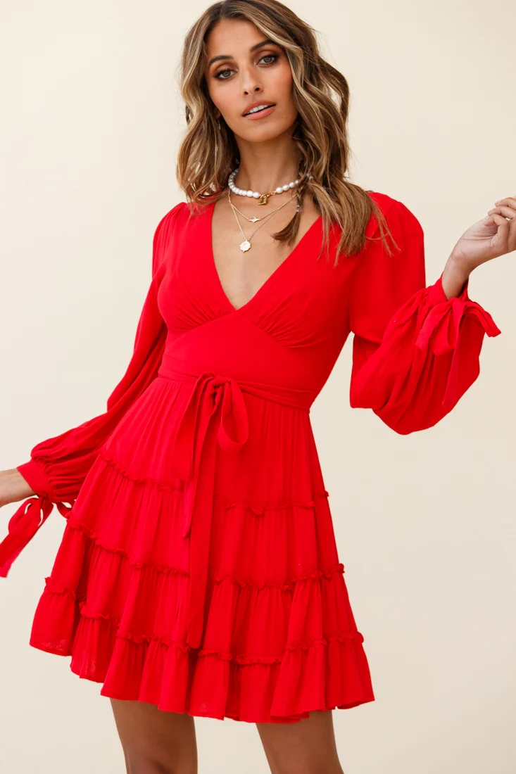 Jocelyn Long Sleeve Tied Cuff Frill Dress Red