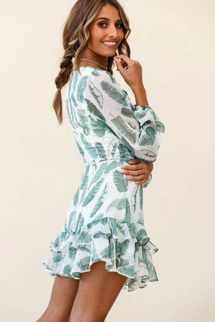 Dayton Bell Sleeve Waist Tie Dress Leaf Print Nude