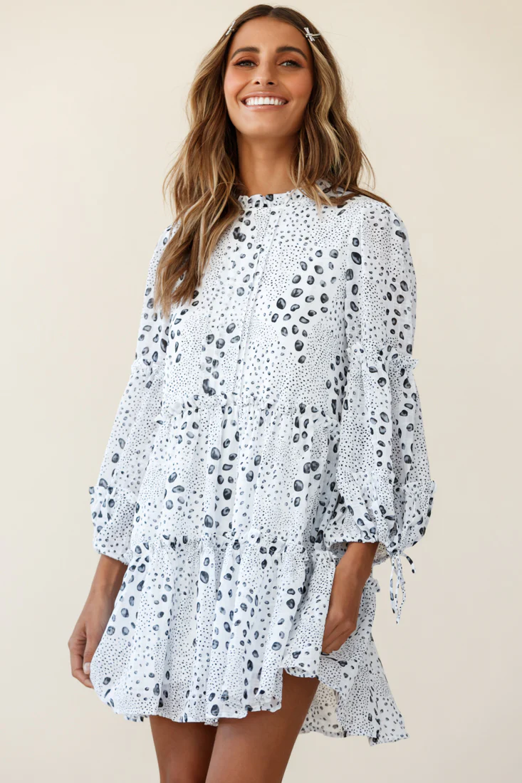 Beatrix High Neck Bell Sleeve Dress Droplet Print White