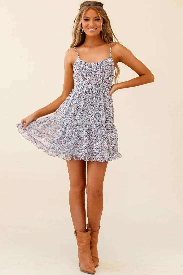 Eternal Sunshine Gathered Bust Babydoll Dress Ornate Floral Print Pink