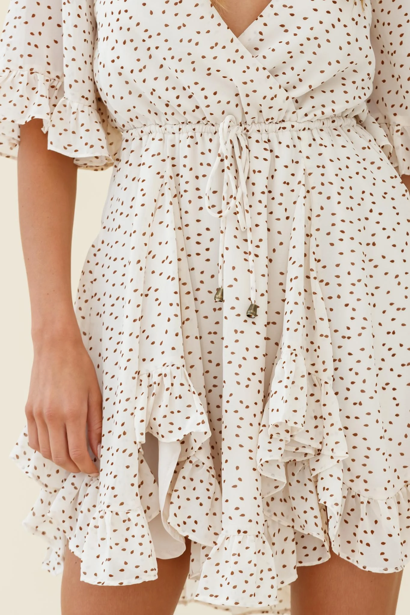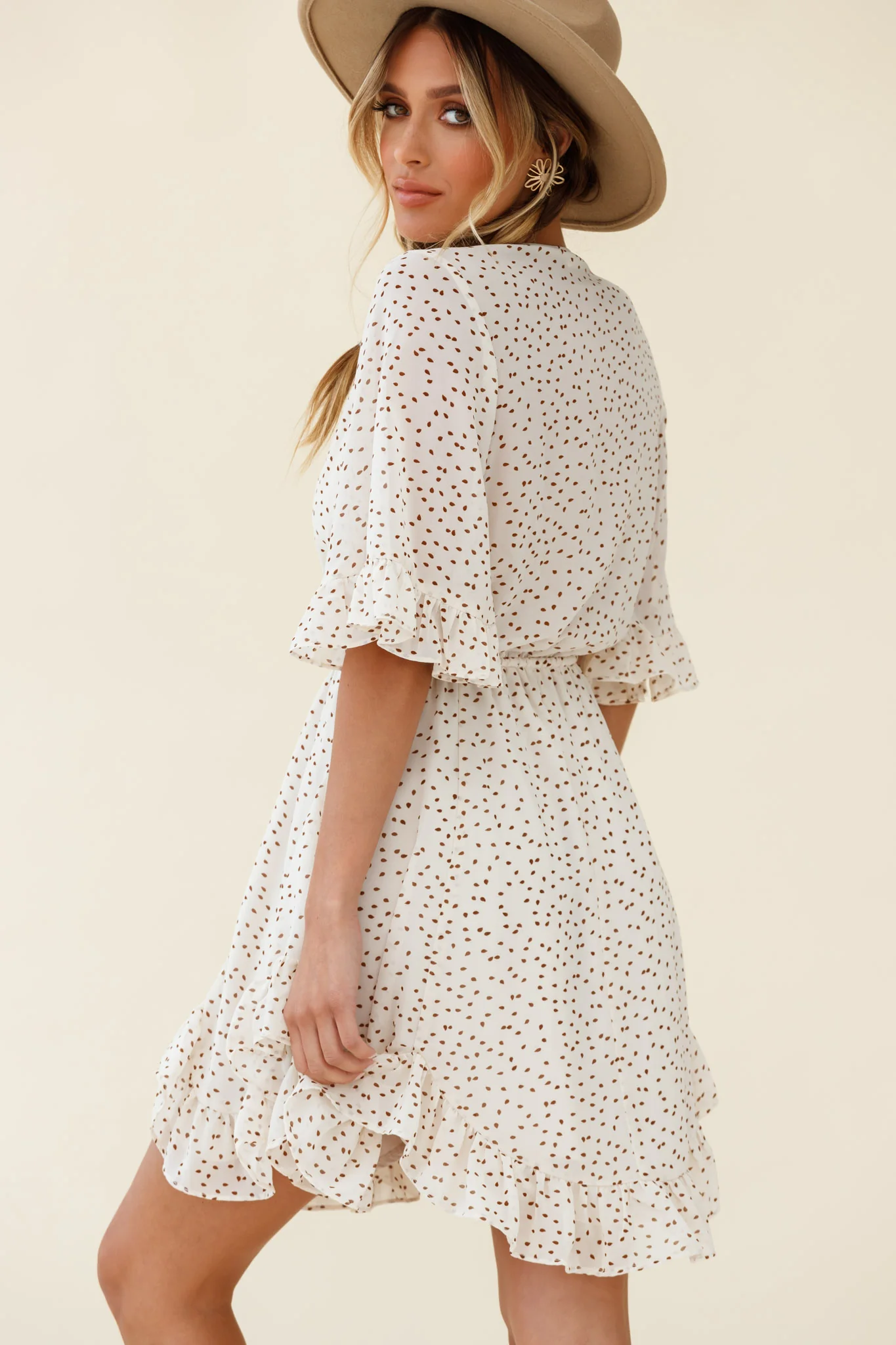 El Cerrito Flared Sleeve Godet Hem Dress Speckle Print Beige