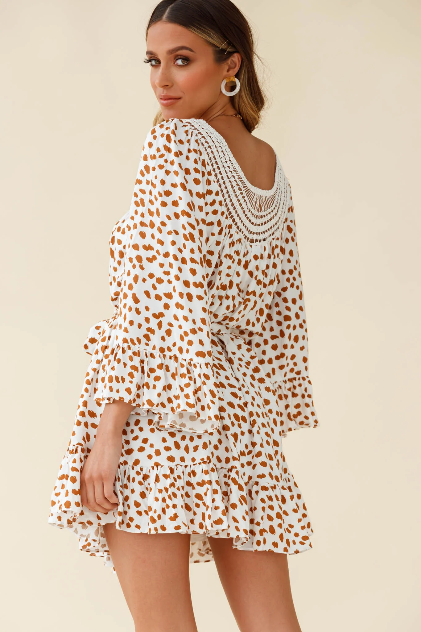 Turn Back Time Long Sleeve Crochet Neckline Dress Animal Print White/Brown