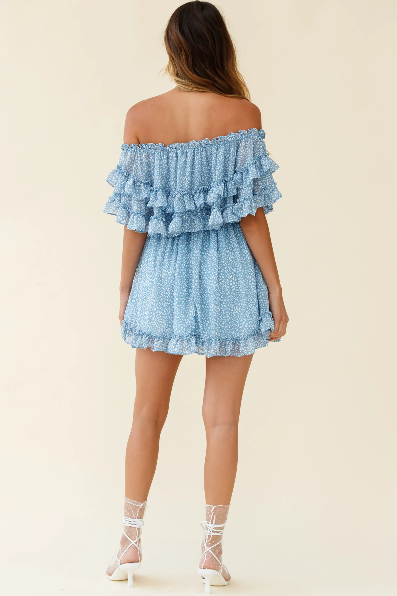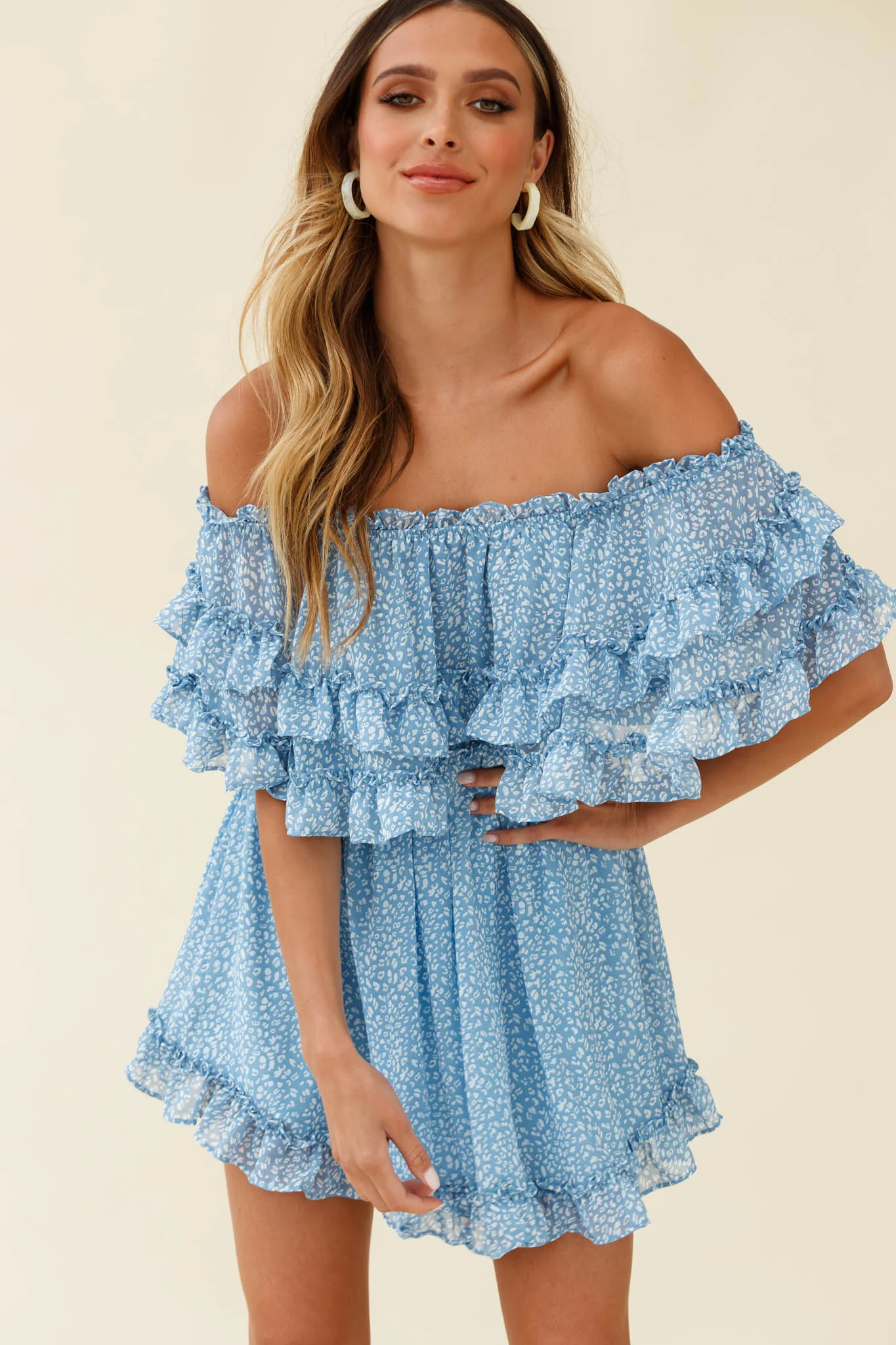 Meet Me At Sunset Bardot Neckline Frill Trim Dress Speckle Print Blue