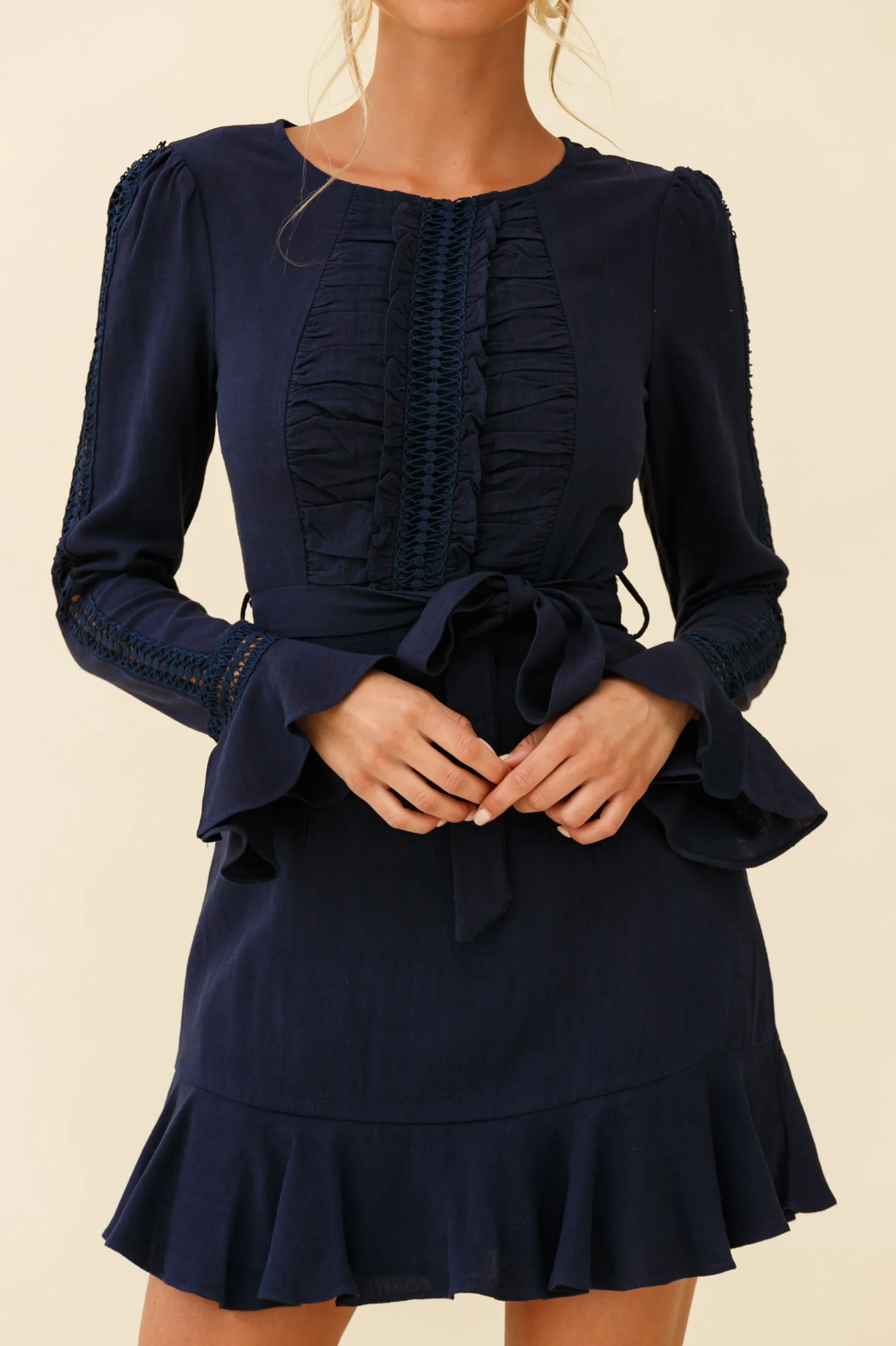 Gardenia Long Sleeve Frill & Crochet Trim Dress Navy