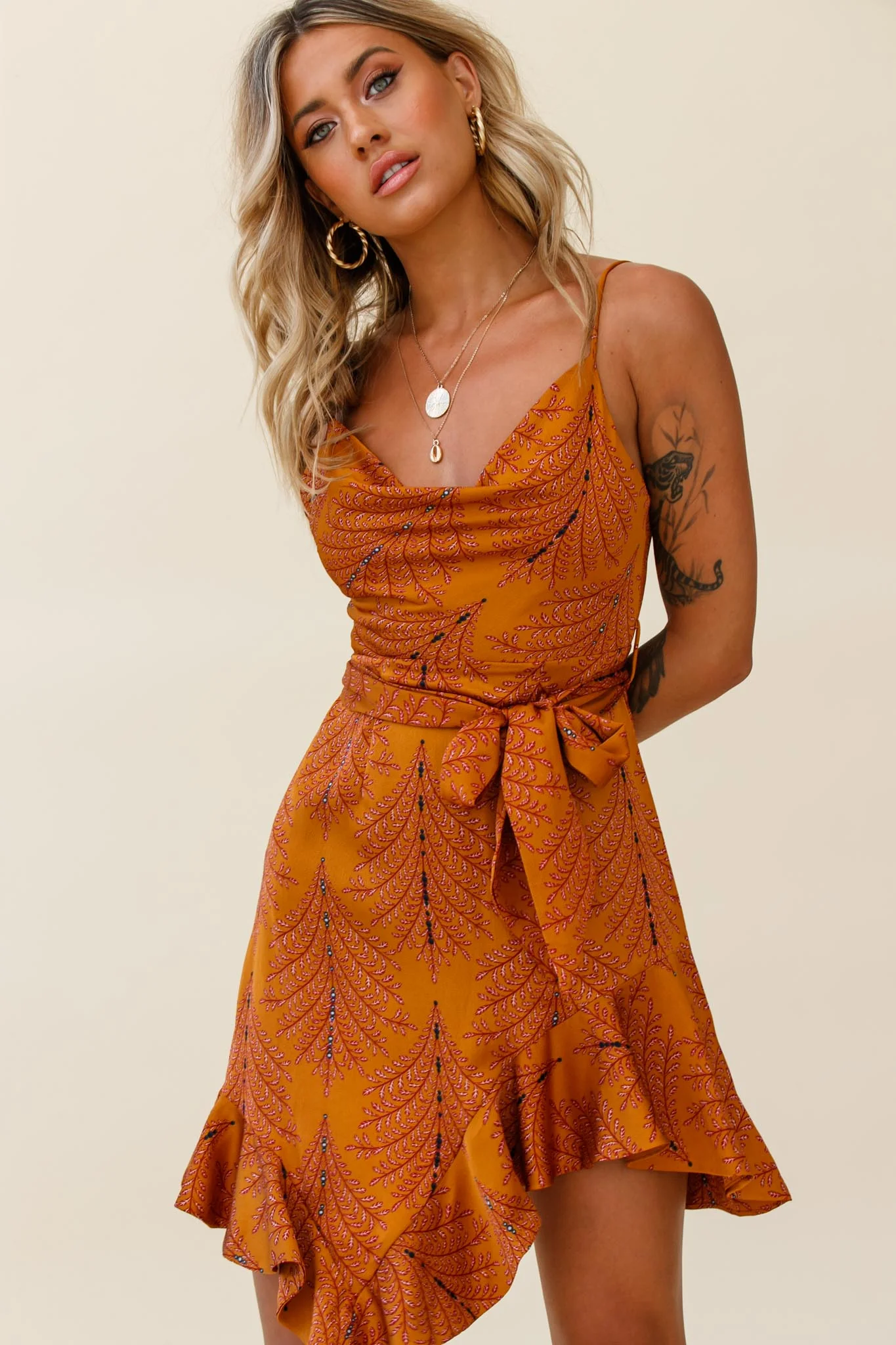 On The Prowl Cowl Neck Asymmetrical Hem Dress Leaf Print Tan