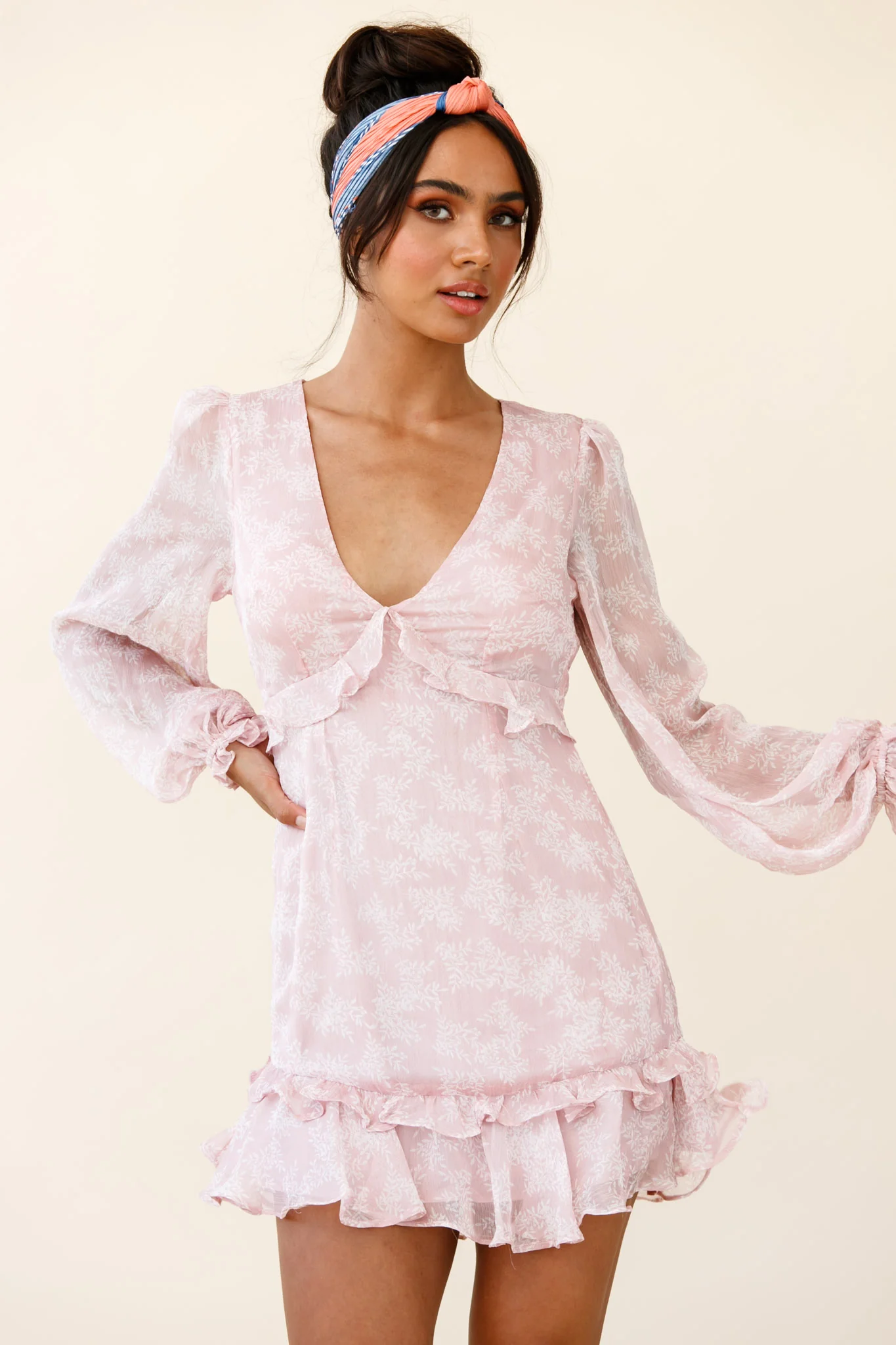 Amarantha Sheer Balloon Sleeve Frill Trim Dress Floral Print Pink