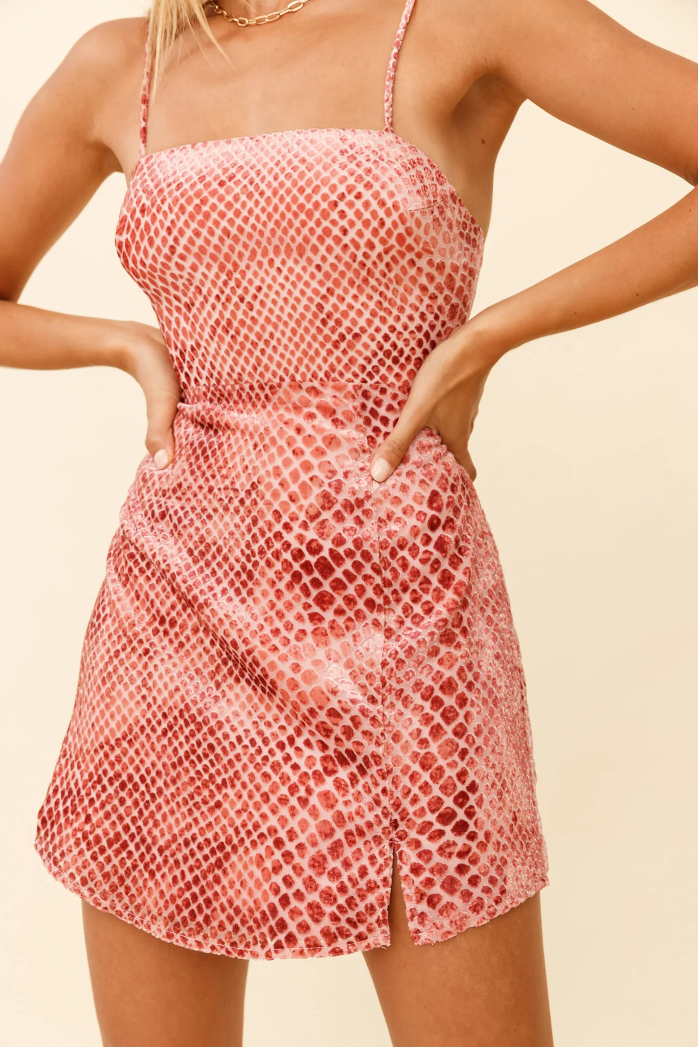 Atlanta Square Neckline Velour Dress Snakeskin Print Rust
