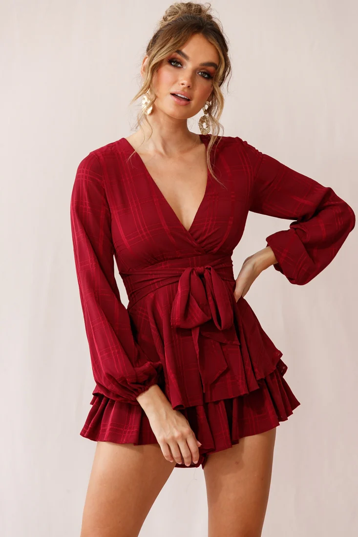 Maddox Fit & Flare Long Sleeve Romper Wine