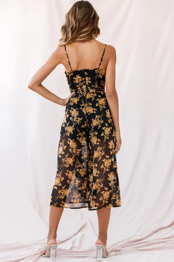 Constance Thin Strap Midi Jumpsuit Black/Orange Flower