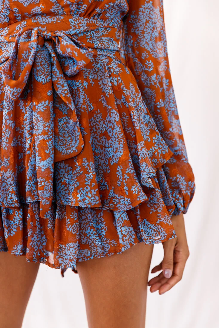 Maddox Fit & Flare Long Sleeve Floral Romper Tan