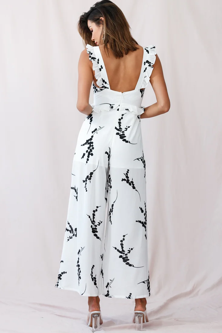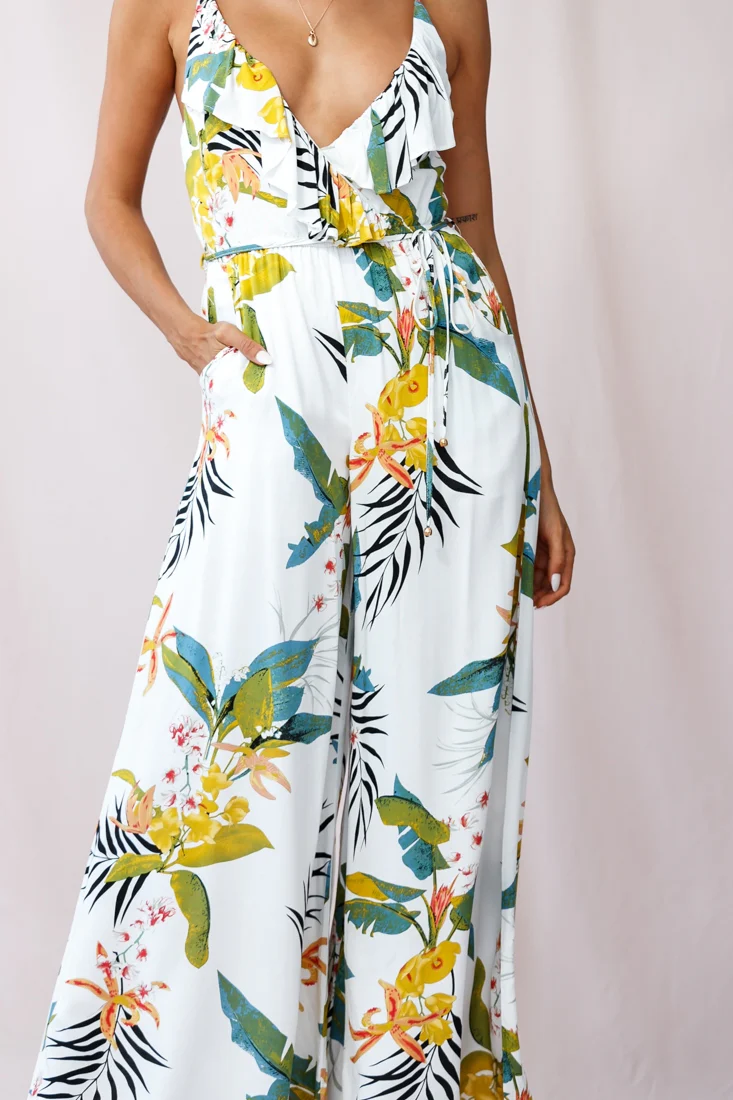 Melita Ruffle V-Neckline Jumpsuit Tropical Print White