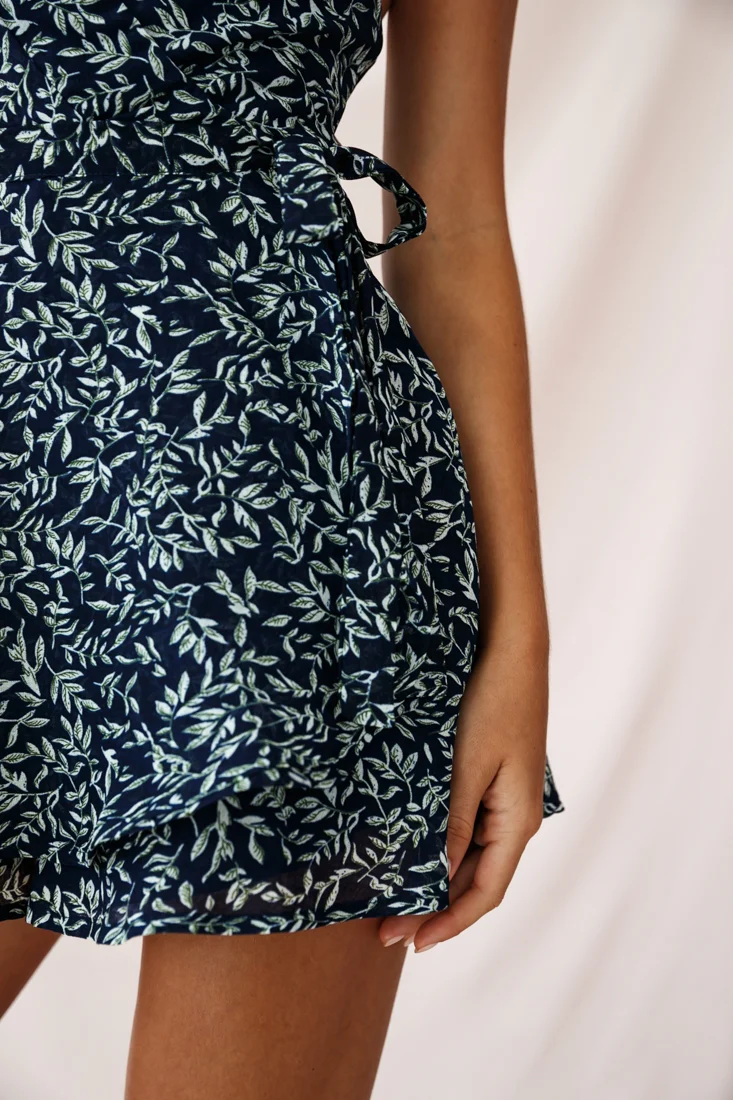 Beachwood Wrap Skirt Cami Strap Romper Leaf Print Navy