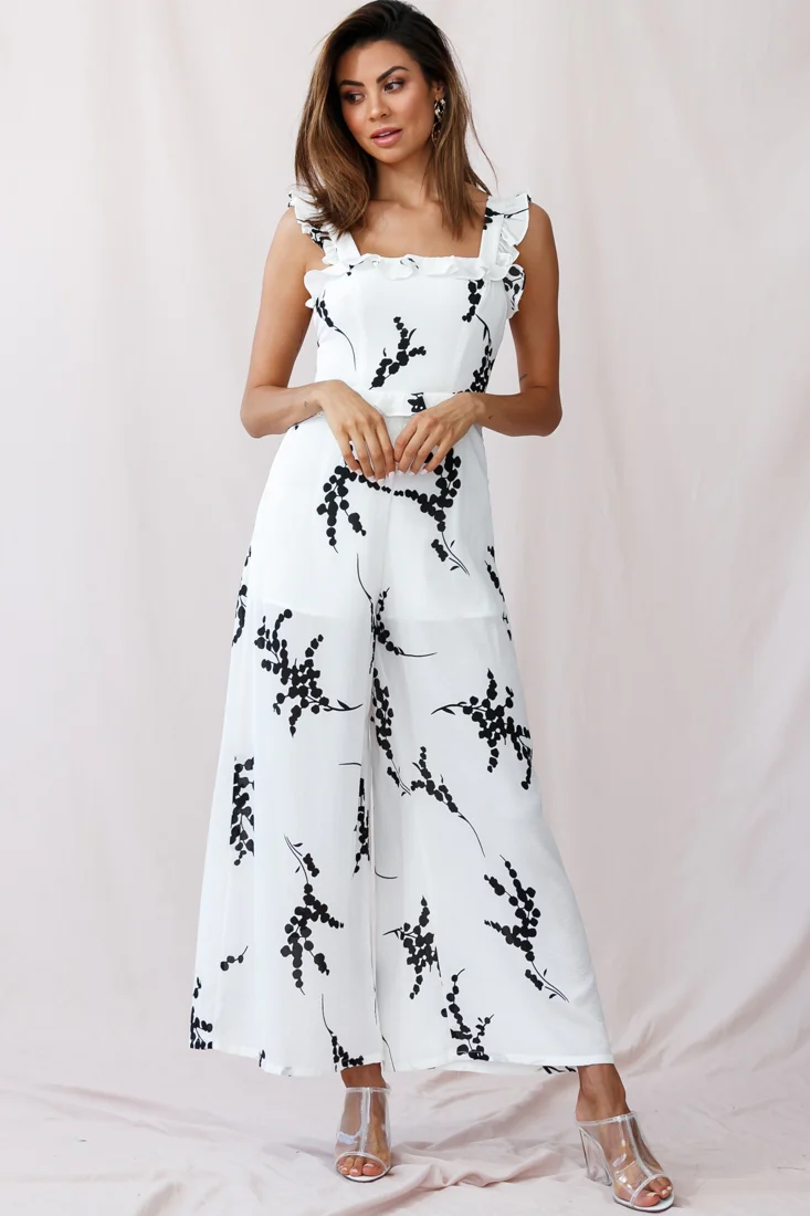 Azure Frill Strap Wide Leg Jumpsuit Floral Print White