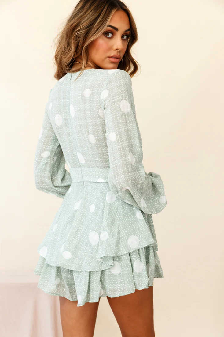 Maddox Fit & Flare Long Sleeve Romper Polka Dot Print Green