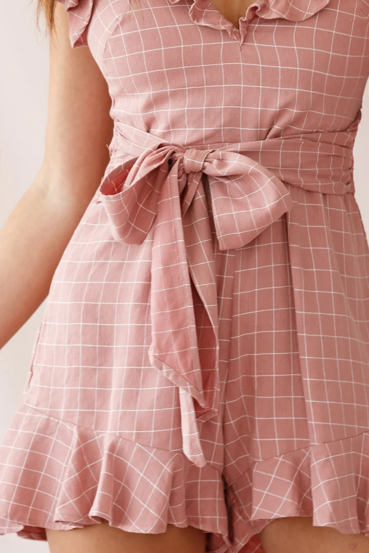 Talitha Waist Tie Lace Trim Romper Mauve