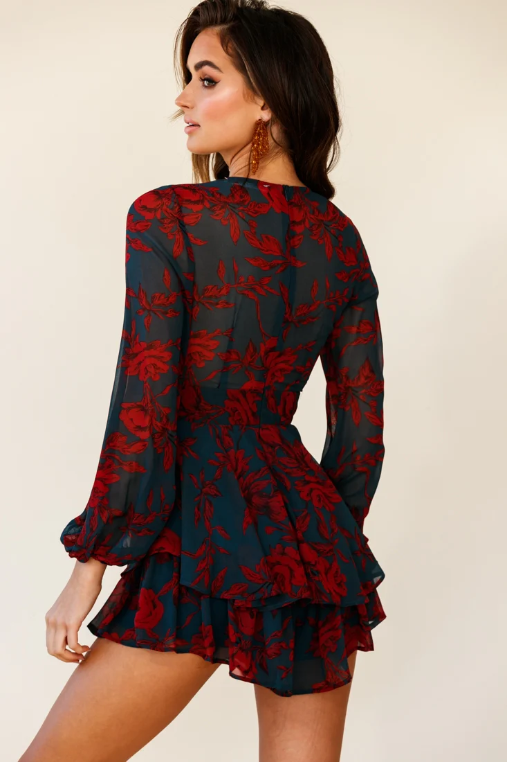 Maddox Fit & Flare Long Sleeve Romper Floral Lace Forest Green