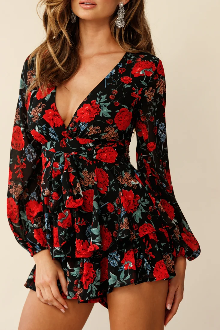 Maddox Fit & Flare Long Sleeve Romper Floral Print Black