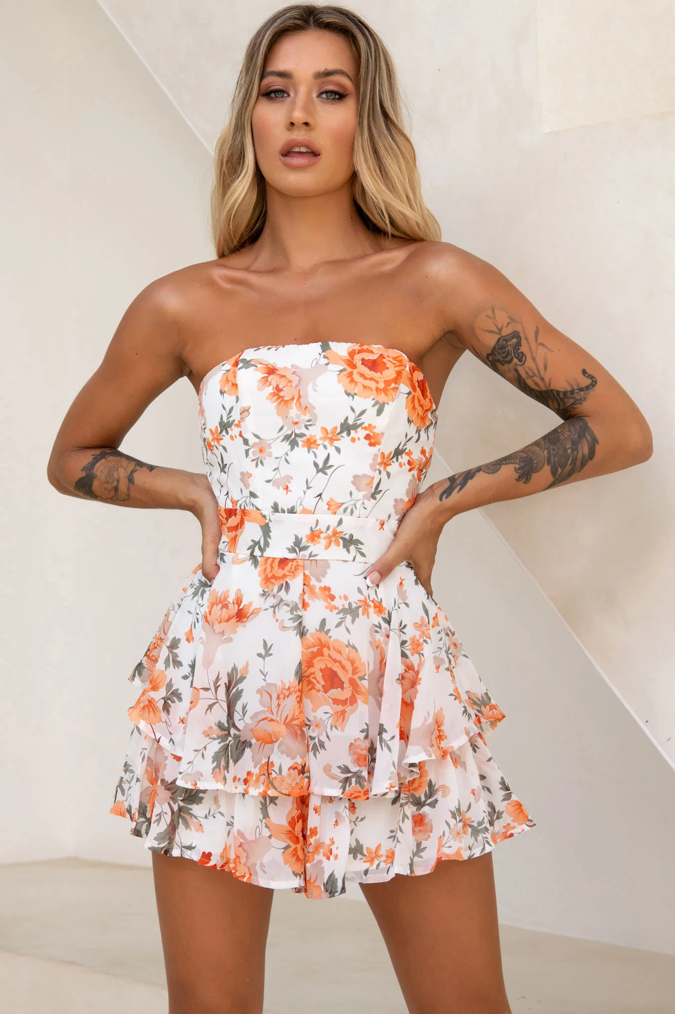 Chase The Sun Tie Bust Frill Romper Floral Print Orange