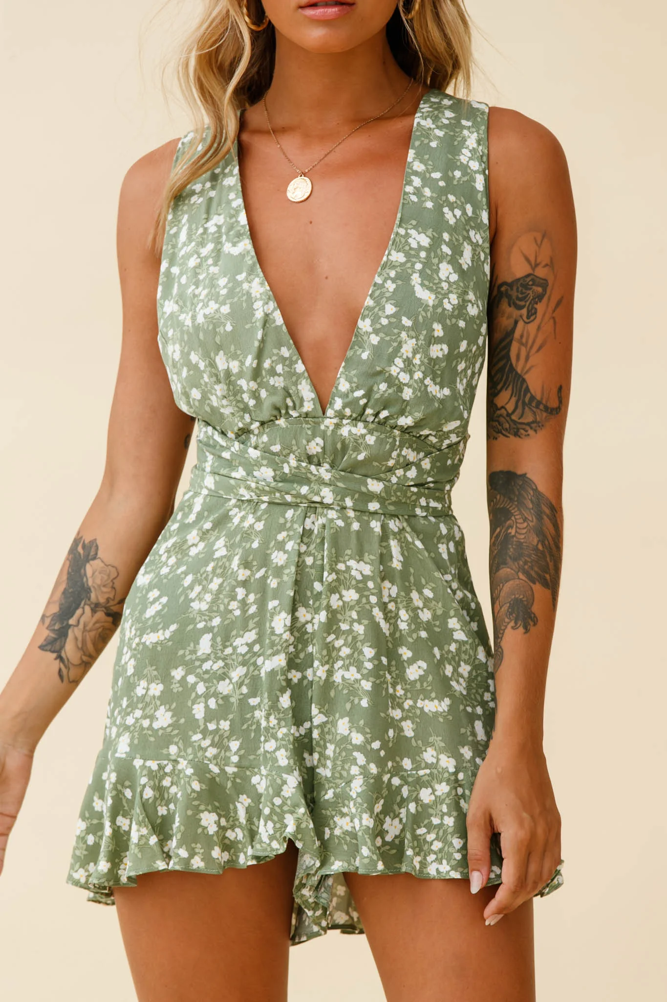 Meet Me Halfway Cut-Out Bust Waist Tie Romper Floral Print Sage