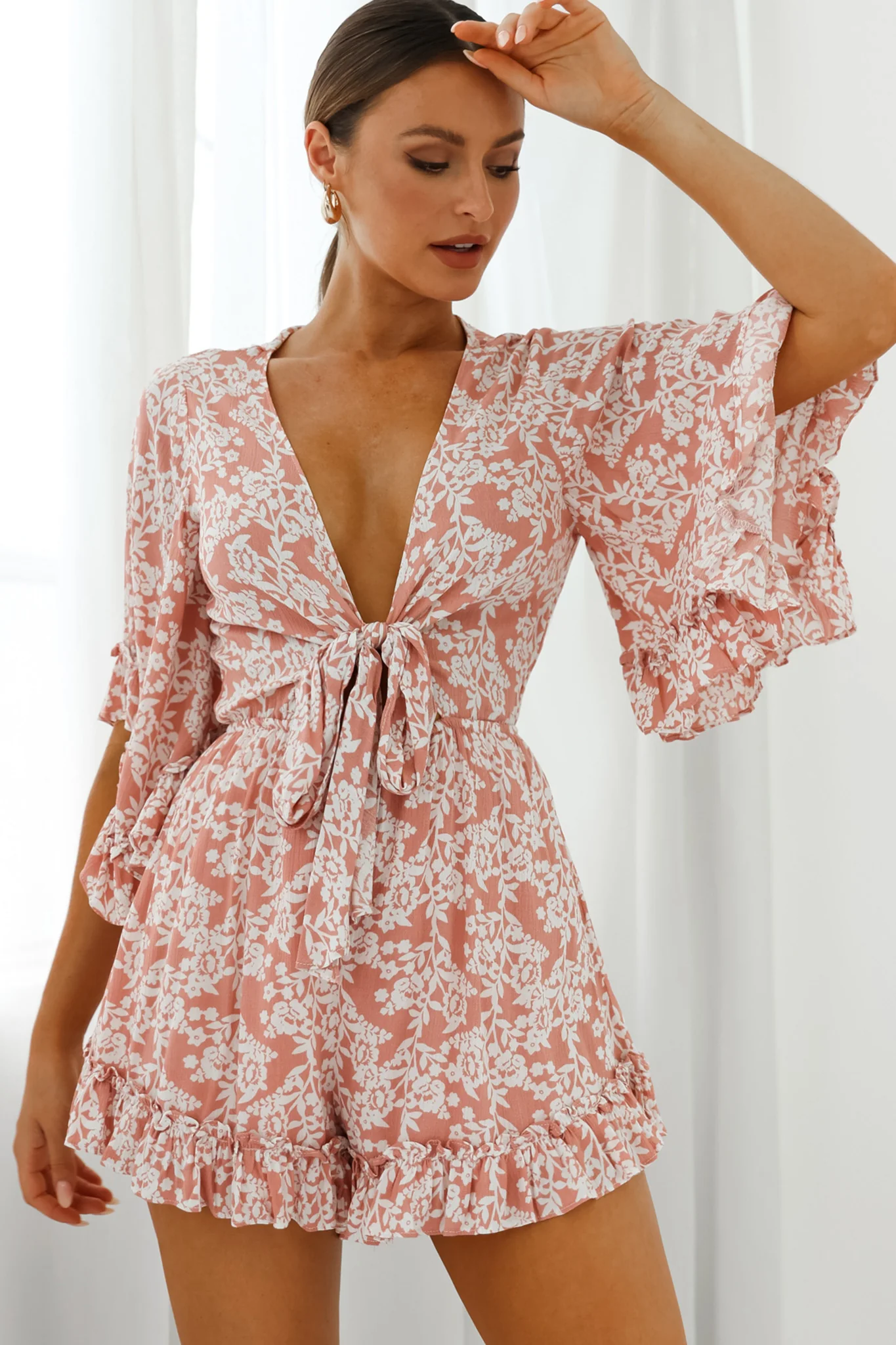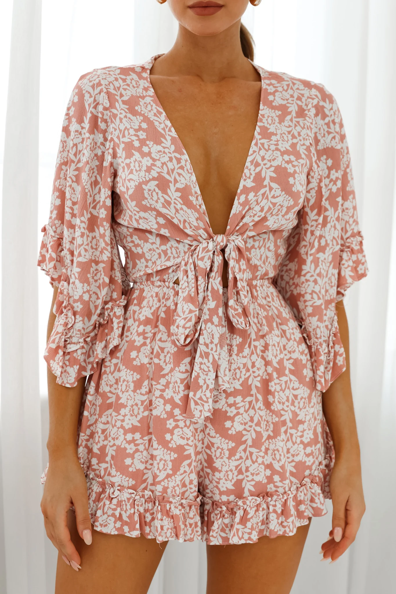 Athira Tied Bust Flared Sleeve Romper Floral Stencil Print Pink