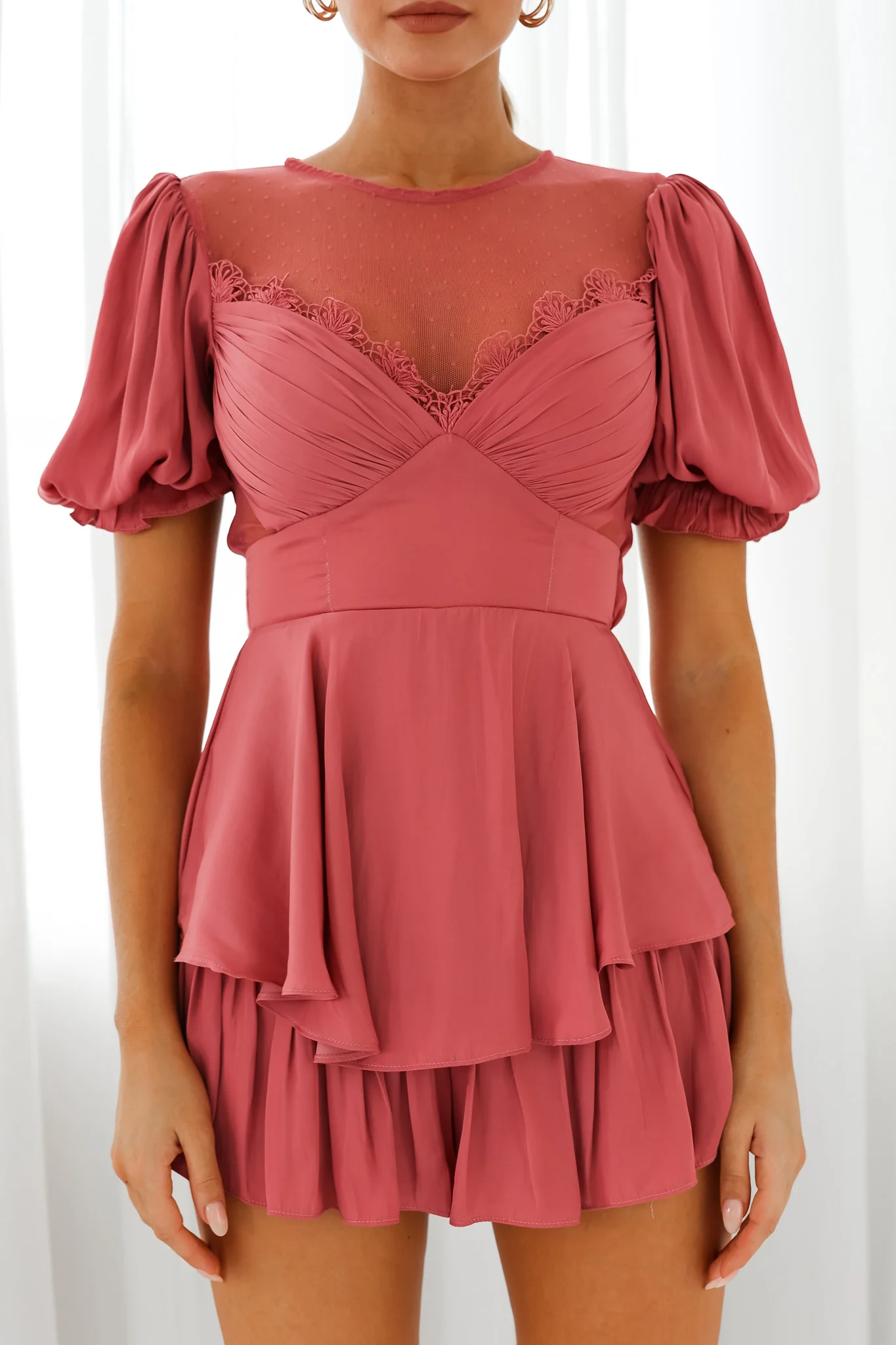 L'amour Lace Mesh Bust Puff Sleeve Romper Rose