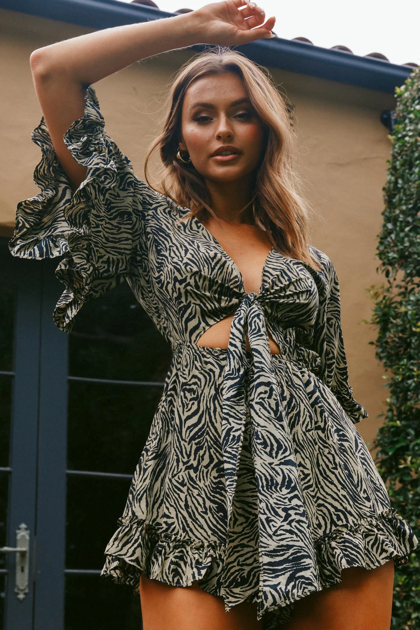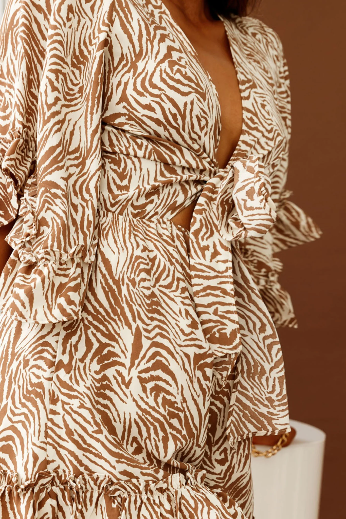 Athira Tied Bust Flared Sleeve Romper Zebra Print Brown/Beige