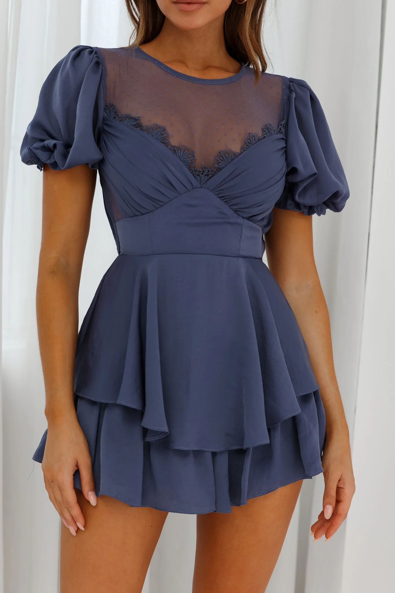 L'amour Lace Mesh Bust Puff Sleeve Romper Midnight Blue