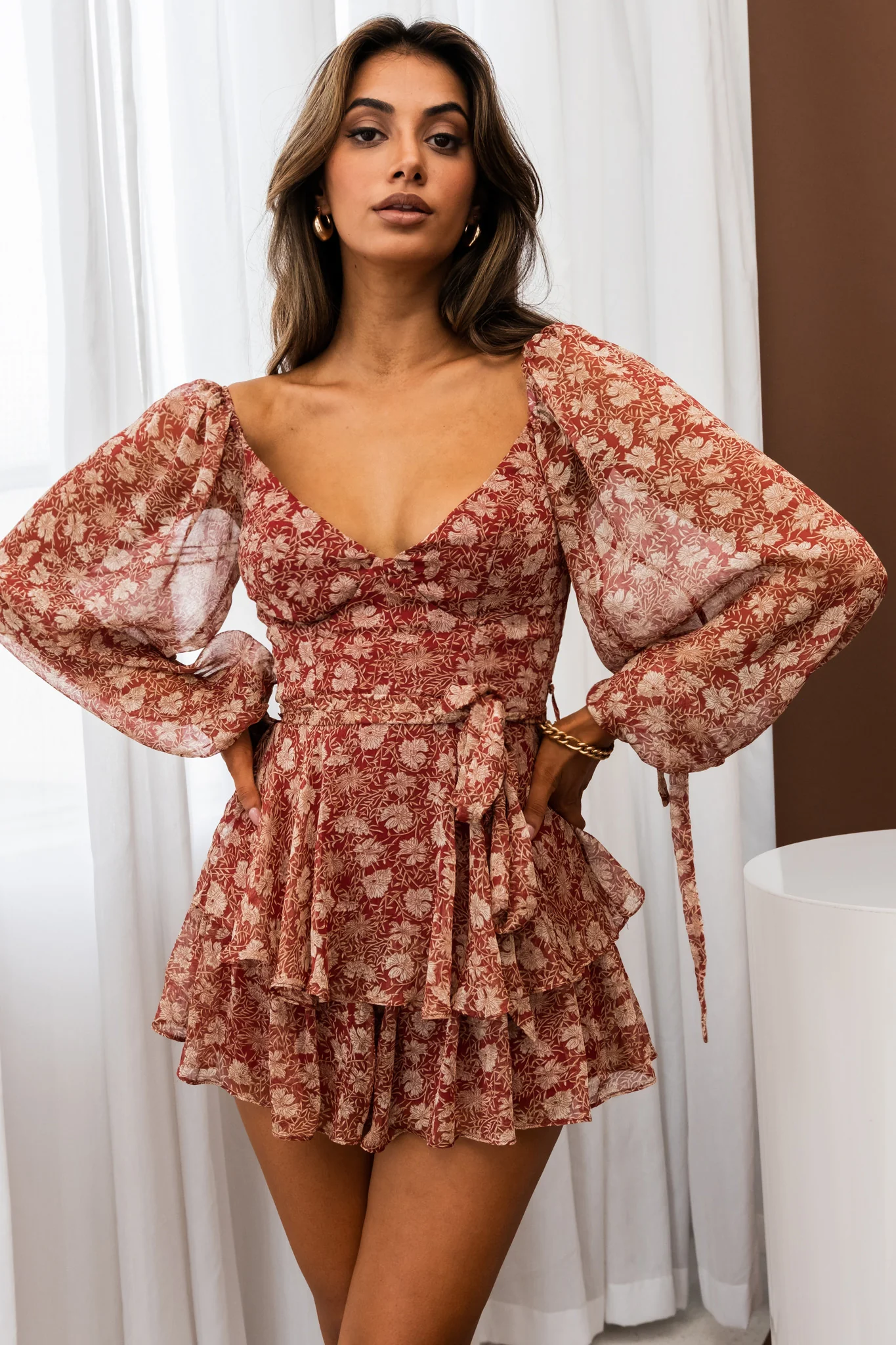 True Love Long Balloon Sleeve Layered Flounce Romper Floral Print Wine