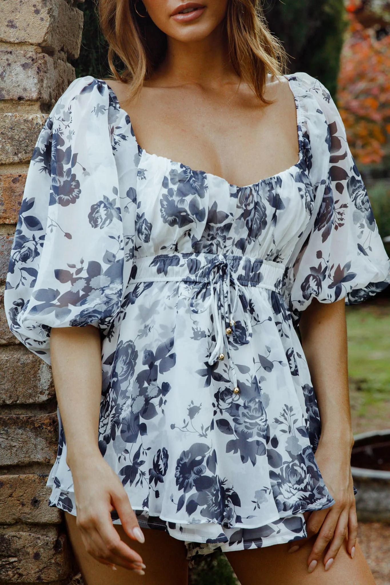 Flora Ruched Bust Puff Sleeve Romper Floral Print Beige